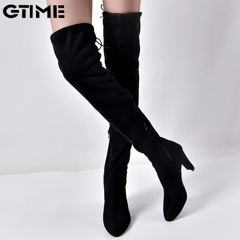 Женские сапоги выше колена из флока, на шнуровке, на высоком каблук...