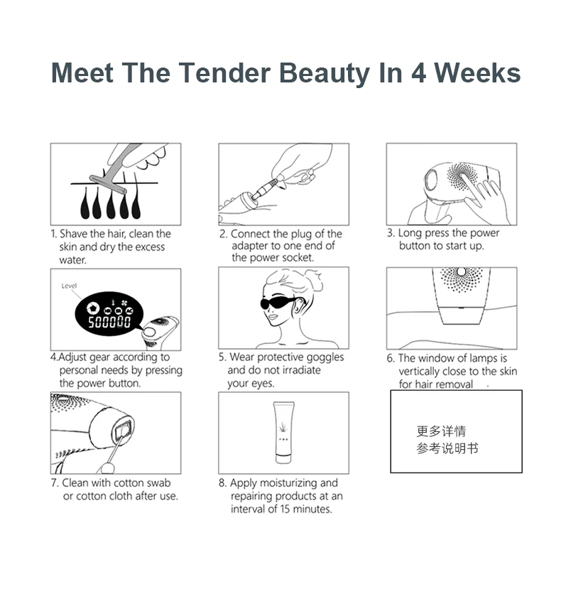 Спецификация продуктаМатериал лампы: КварцВходная мощность: 36 ВтНоминальное напряжение: 100-240 ВСменная Лампа: HR лампа, SR лампа, AC ЛампаНоминальный Частотный диапазон: 50 Гц/60 ГцРабочая температура: 5 °-35 °Температура хранения: 0 °-45 °Рабочая влажность: 25%-75%Срок службы лампы: 500000 вспышек О товареСистема удаления волос IPL имеет компактный дизайн, который идеально подходит для использования в вашем доме или на ходу.Безопасное постоянное удаление волос дома. Результаты клинически доказаны: на 82% меньше волос через 1 месяц после 8 занятий.Идеально подходит для удаления волос всего тела, включая руки, подмышки, линии бикини, ноги, спину, лицо и грудь.Устройство для удаления волос Высокая совместимость: эффективно подходит для различных типов кожи, эксклюзивная кожаСистема обнаружения.IPL безболезненное удаление волос глубоко в волосяные фолликулы, нагрев поглощается меланином, гарантия 2 года, пожизненное обслуживание. Информация о продуктеКак работает IPL?1) Используйте бритву для удаления волос на месте, чтобы обеспечить эффект. В противном случае шанс будет выгореть.2) Нажмите и удерживайте "ключ переключателя» в течение более 3 секунд, и первый светильник 5 светильник индикатора интенсивности светильник включен. Пользователи могут увеличить (уменьшить) Интенсивность светильник, нажав на эту кнопку.В общей сложности может быть выбран 5 циркулирующий светильник интенсивности, 1 имеет самую низкую энергию, и 5 имеет самую высокую энергию.3) яркий зеленый светильник будет ярким в течение 2-3 секунд после запуска, что указывает на то, что машина готова к использованию.4) после того, как будет готов светильник включен, прикрепите бритую голову к той части, где необходимо депиляция волос (пожалуйста, удалите волосы из части волос, которая должна быть удалена в первую очередь, чтобы избежать горения), И избегайте нажатия триггера в процессе.5) когда лысая головка полностью прикрепляется к коже, будет мигать готовый светильник, что указывает на то, что ее можно отполировать.6) когда вы нажмете на спусковой механизм, вы услышите «пуф» и закончите.Как использовать?Шаг 1: бритье и очистка обработанной области;Шаг 2: Наденьте очки, чтобы не использовать светильник IPL, стимулирующий глаза;Шаг 3: Выберите подходящий уровень энергии;Шаг 4: Позвольте окну обработки прикоснуться к обработанным участкам вертикально и обработать области по очереди. Не нужно повторять и опускать;Шаг 5: обработайте область вокруг глаз и повторите шаг 4 2-3 раза;Шаг 6: нанесите крем против волос после лечения;Шаг 7: Отключите питание и используйте влажную ткань или ватный тампон для очистки окна;Шаг 8: поместите устройство и аксессуары в упаковочную коробку и храните в безопасном месте.