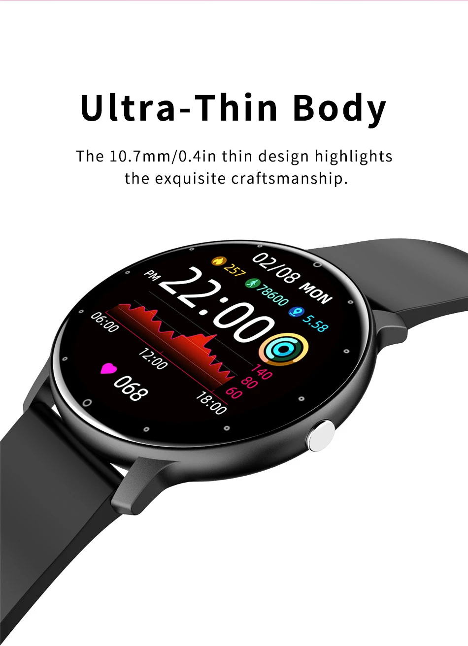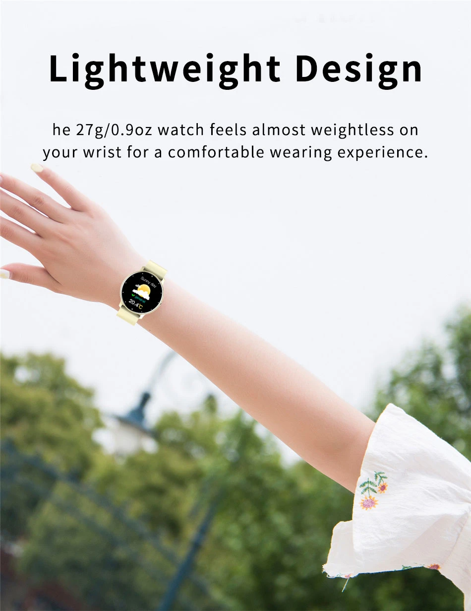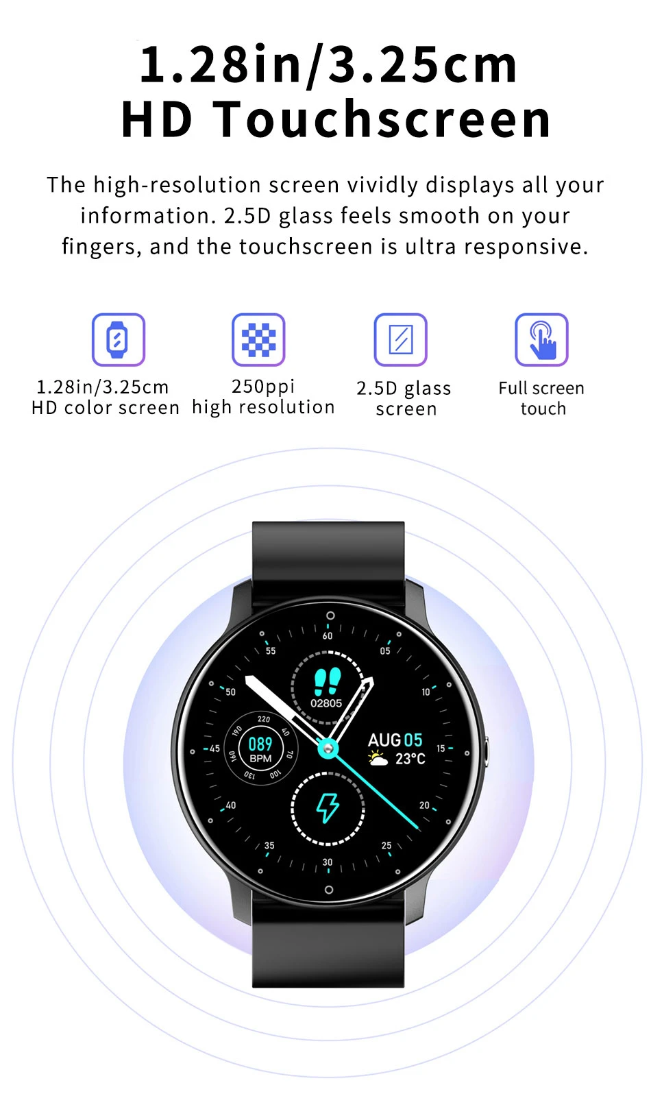 1. Сенсорный экран 28 дюймов/3,25 см HDЭкран с высоким разрешением ярко отображает всю вашу информацию. 2.5D стекло гладко на пальцах, и сенсорный экран очень чувствителен.1.28in/3,25 cm HD цветной экран-250ppi Высокое разрешение-2.5D стеклянный экран-Полный сенсорный экран