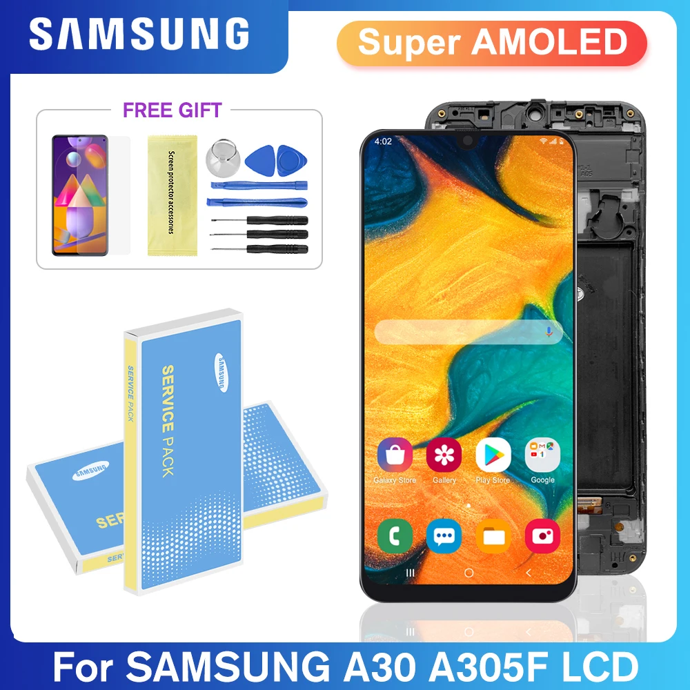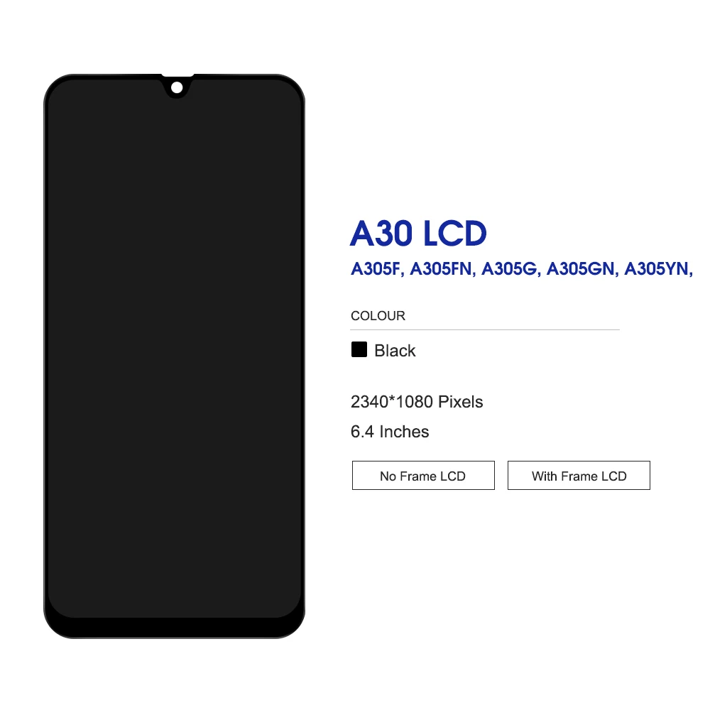 ЖК-дисплей 6,4 дюйма Super AMOLED с сенсорным экраном и дигитайзером в сборе для Samsung Galaxy A30, A305F, A305G с рамкой