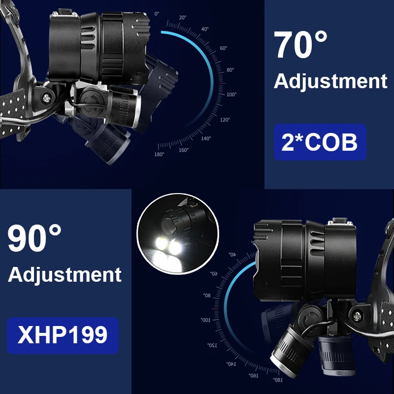 Мы обращаем внимание на качество и обновление продукции, XHP199 + 2 * COB-наша новая фара. Используется новейший 16-элементный светодиодный фитиль XHP199. Фары можно свободно складывать при 70 градусах. Оснащен аккумуляторами 3*18650, его можно использовать непрерывно в течение 6-12 часов без подзарядки, а расстояние освещения превышает 1500 метров. Это самая яркая и мощная фара на AliExpress. Предназначен для активного отдыха, такого как ночная рыбалка/Охота/Кемпинг/спасение/поиск/прогулки/Ночная езда.