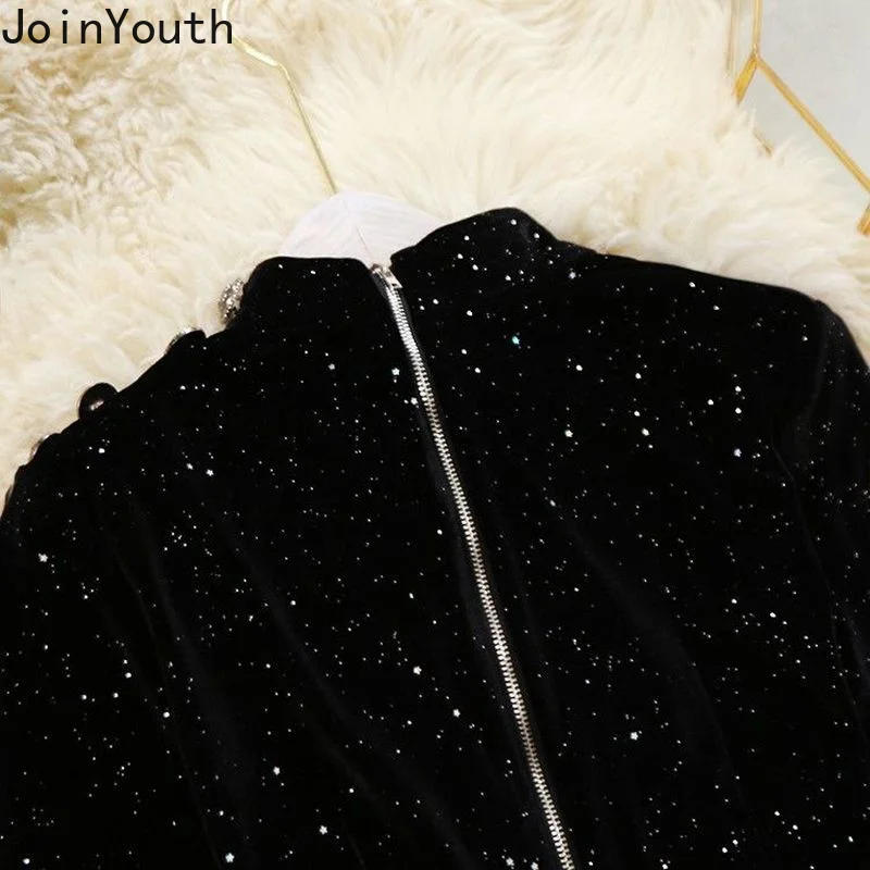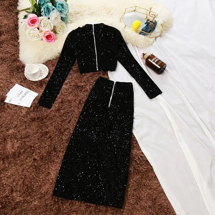 Элегантный женский костюм Joinyouth, золотистый бархатный Шелковый костюм, топ с коротким длинным рукавом и облегающая юбка с разрезом, женская одежда из двух предметов