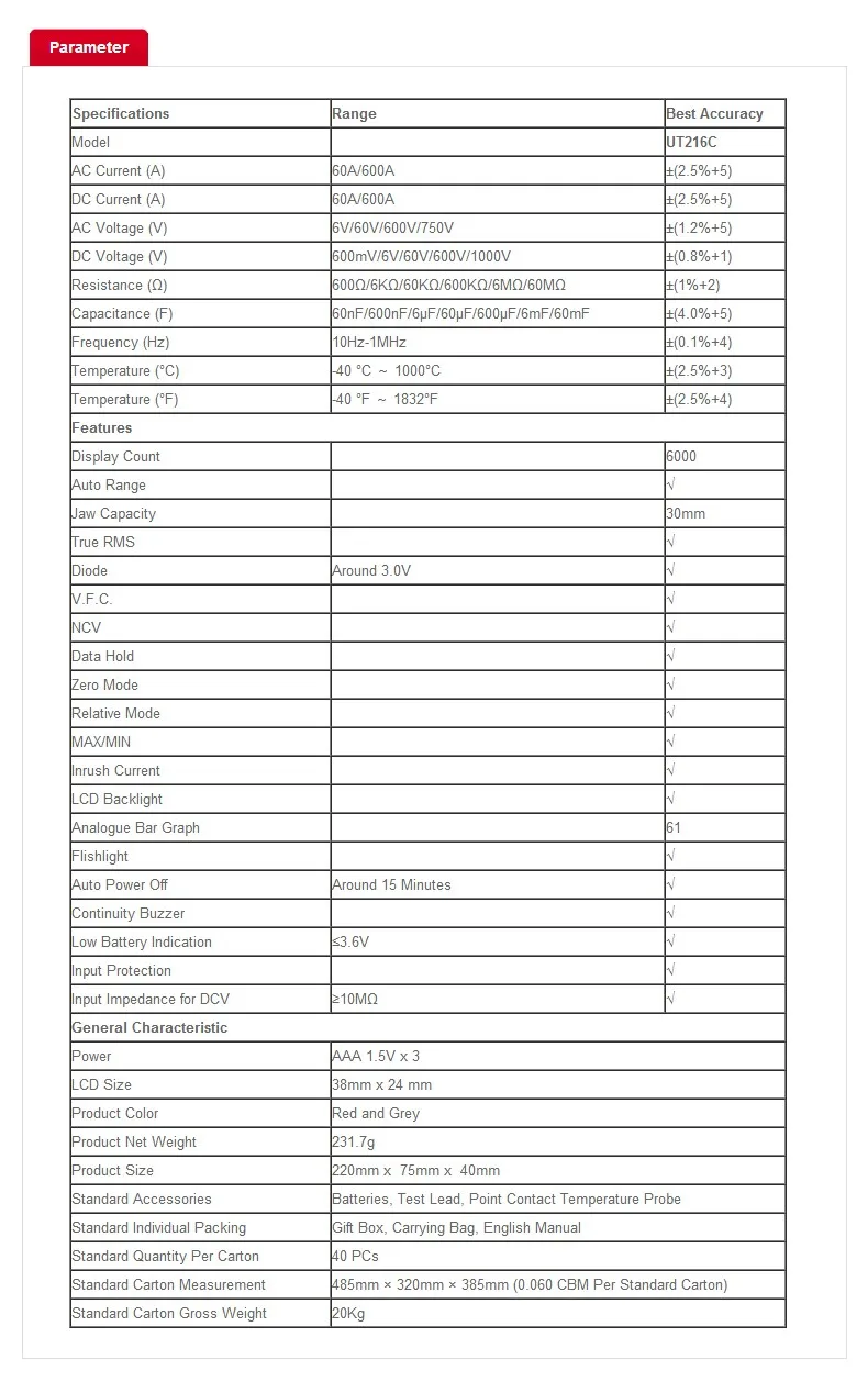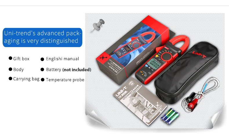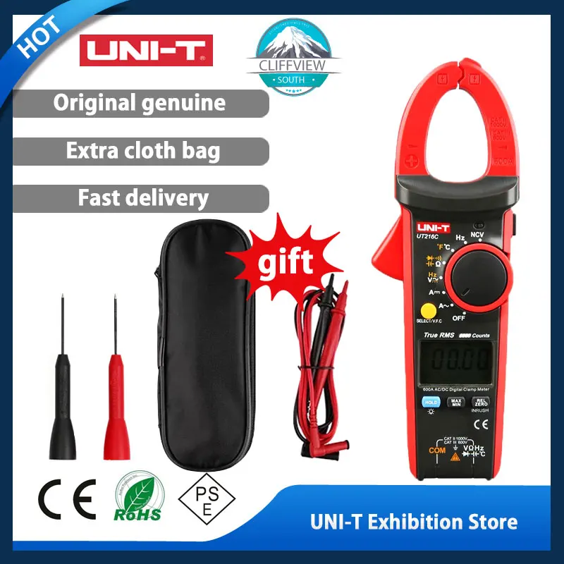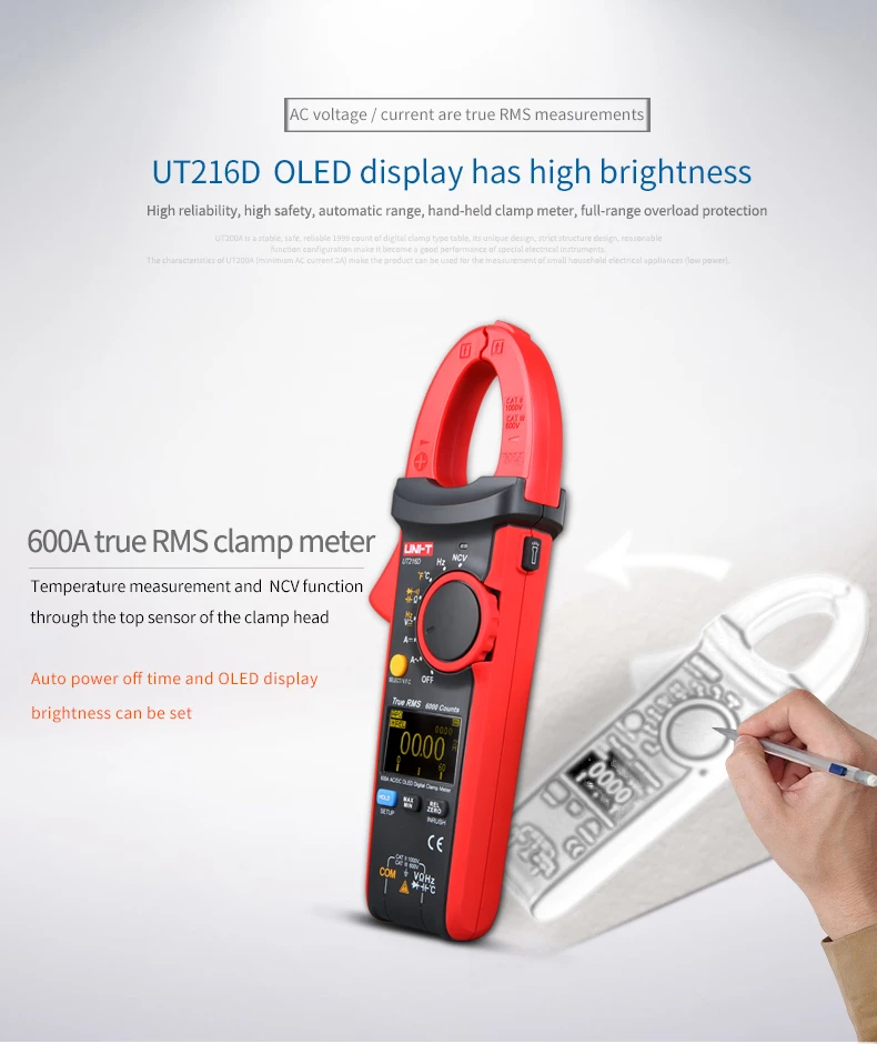 Цифровой токоизмеритель-зажим UNI-T UT216C 600A, мультиметр постоянного и переменного тока с автоматическим диапазоном, NCV V.F.C, тестер температуры с ЖК-диодом и фонариком