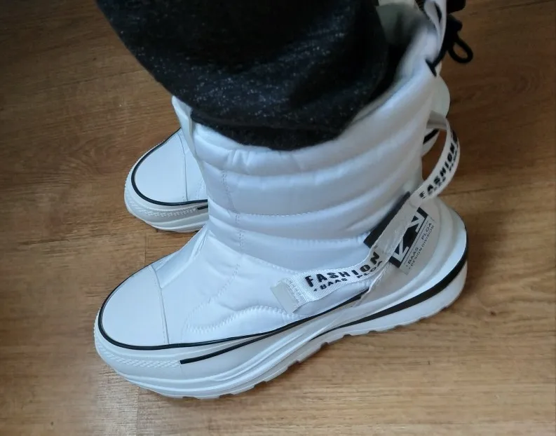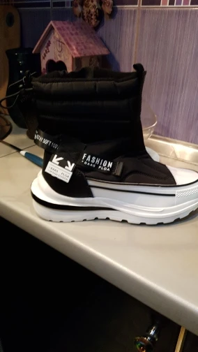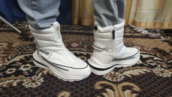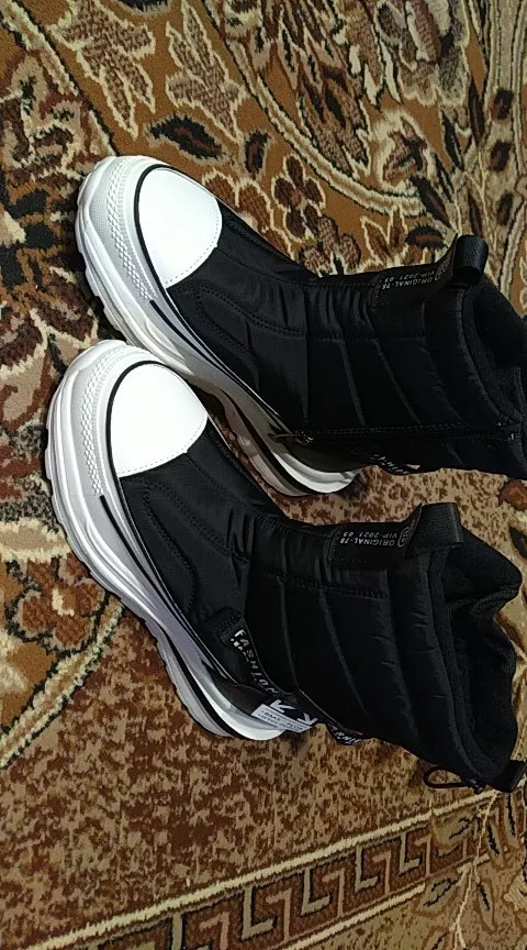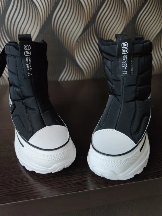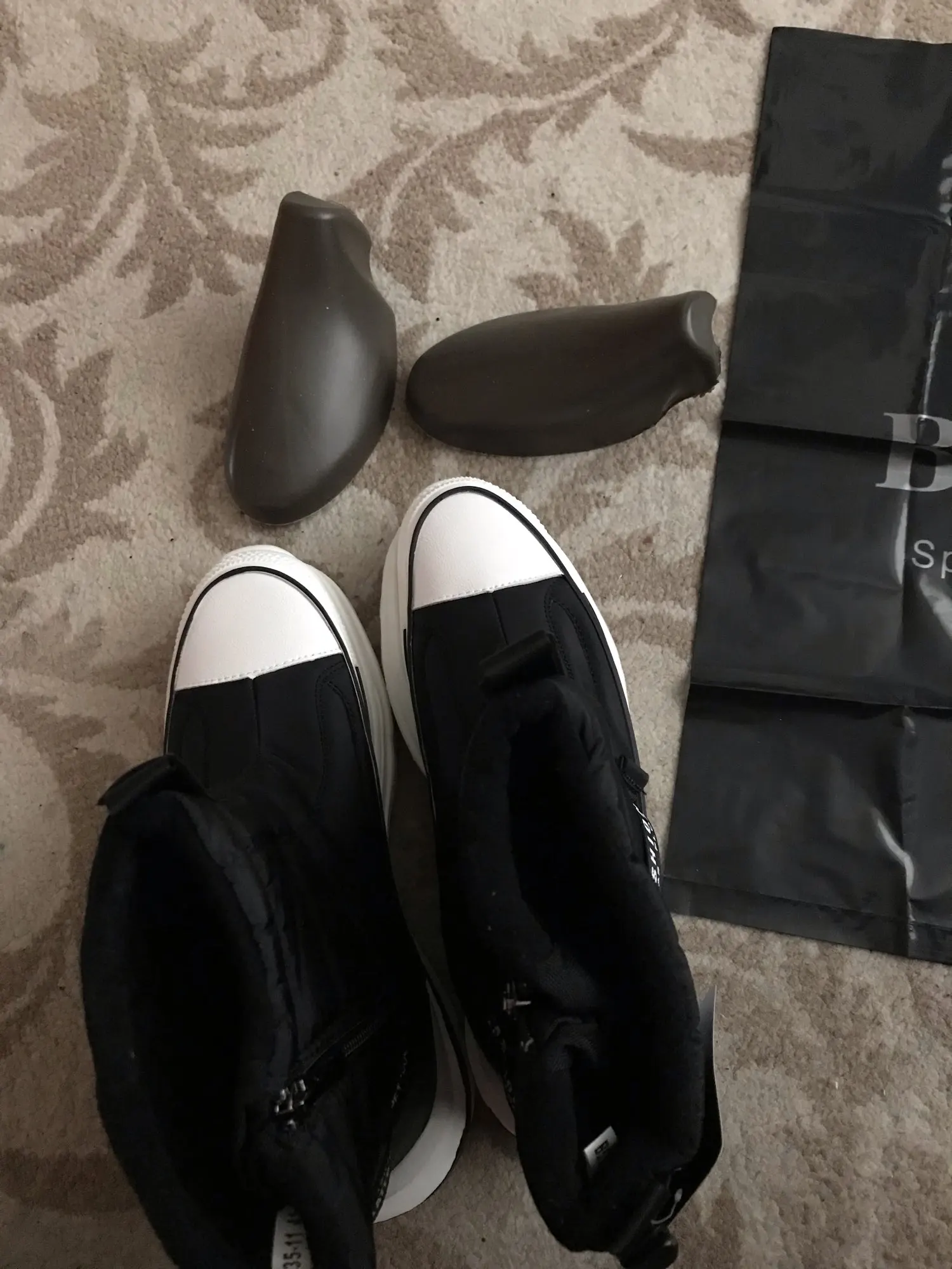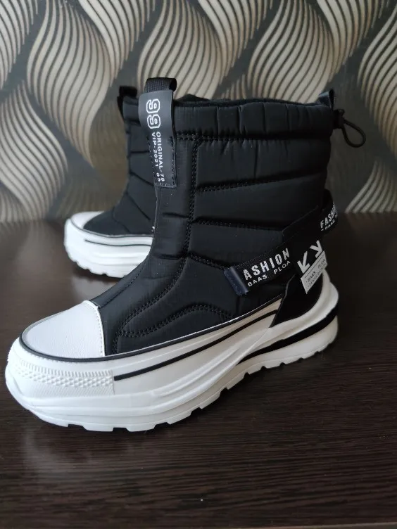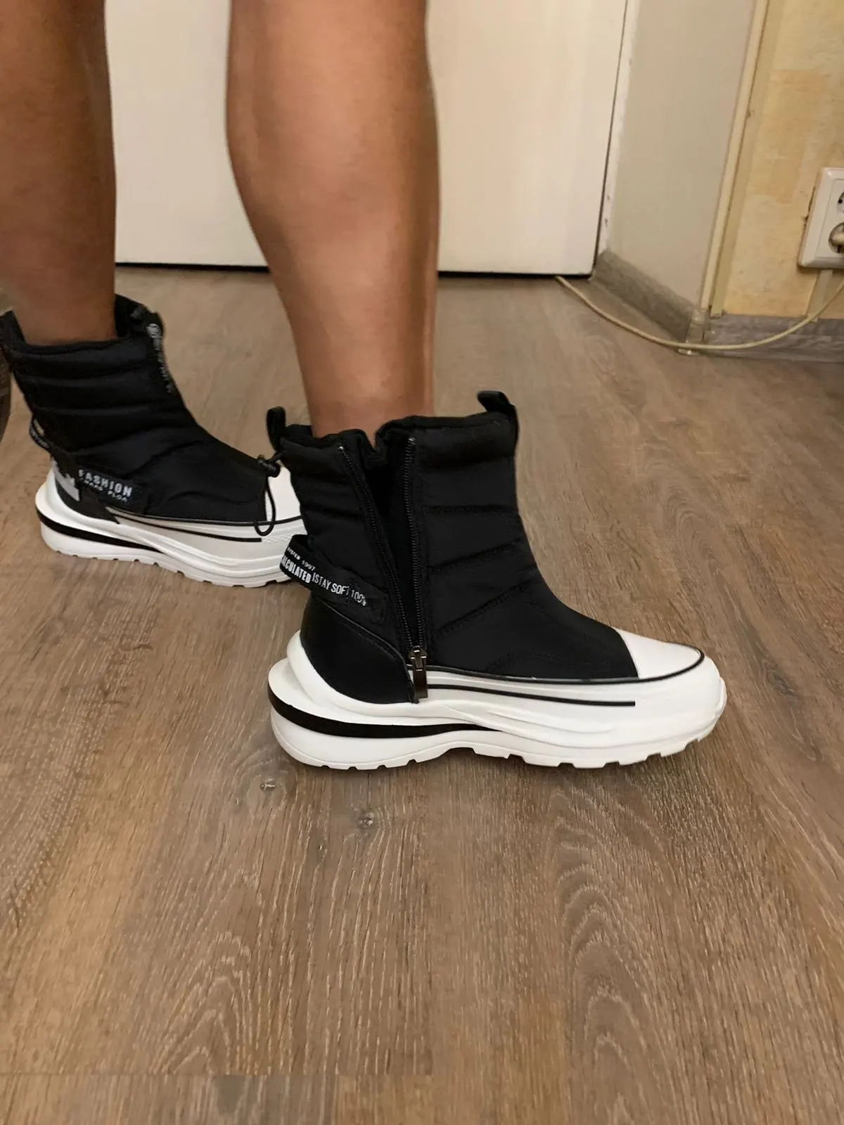 Чорно-білі виглядають дійсно красиво. Я зазвичай ношу кросівки 38 розміру. Цей розмір якраз підходить. Стиль на блискавці легко надягати і знімати, він зручний і теплий. Мені це дуже подобається, хороший продукт.