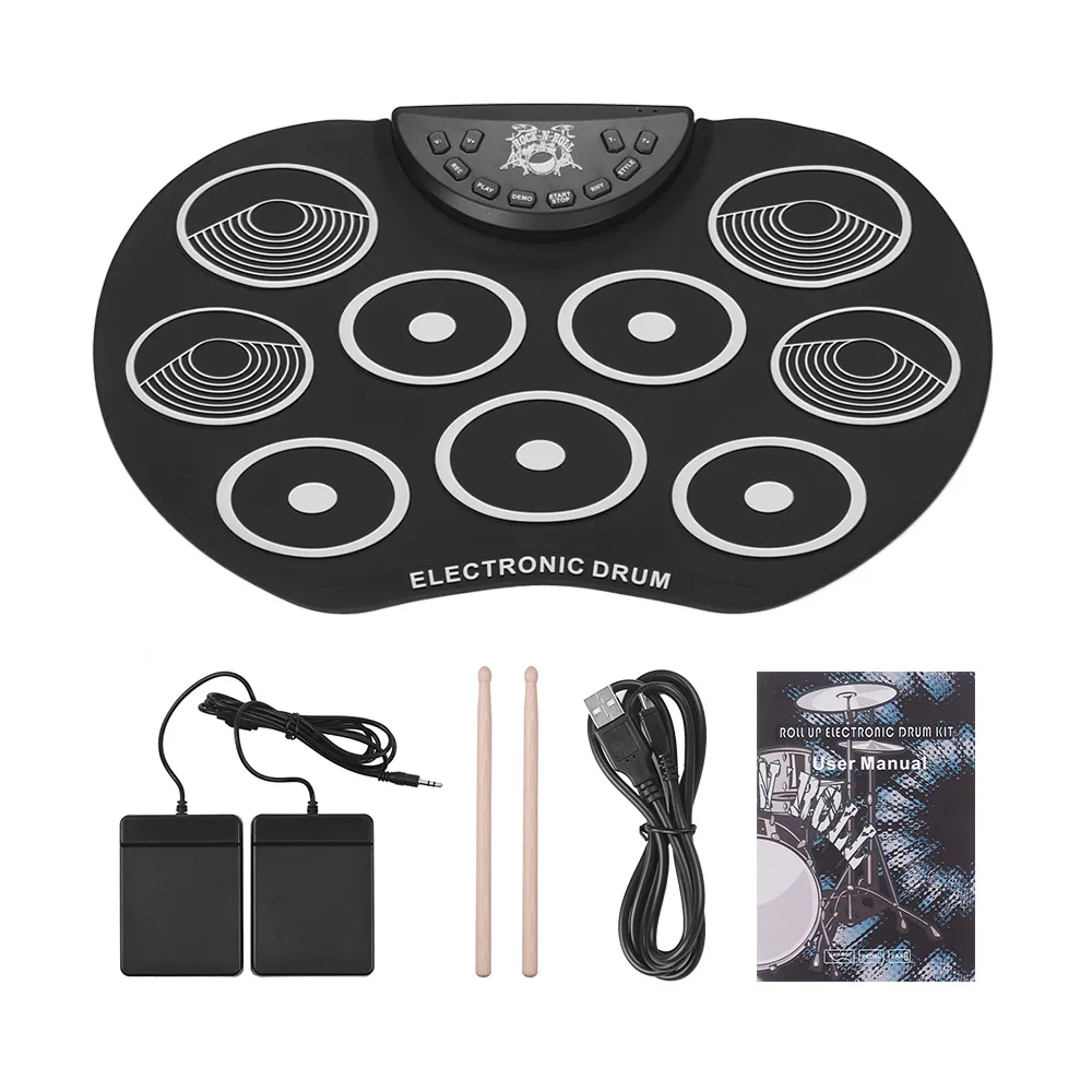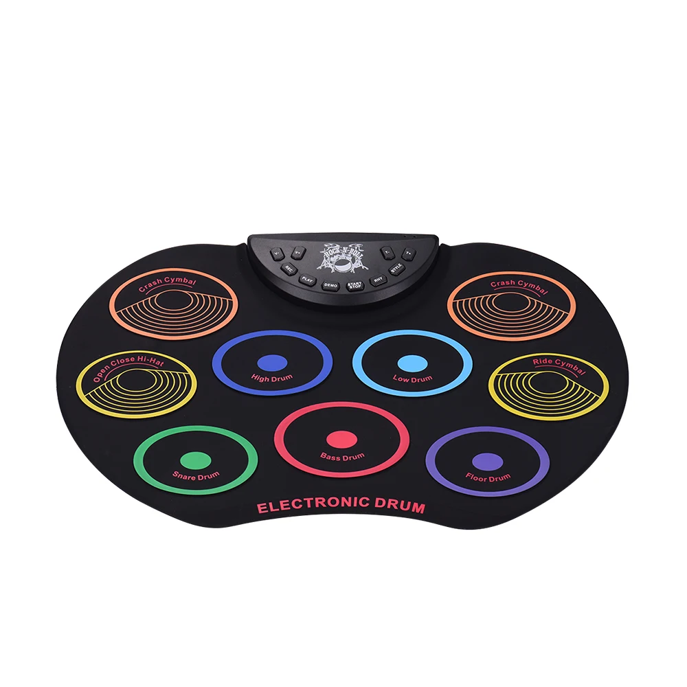 Особенности:Компактный электронный барабан с особой формой, изготовленный из кремния + пластика, легкий и портативный, отличный музыкальный подарок для детей.С 9 красочными барабанными подушечками, включая 3 барабана Tom, 1 барабана snare, 1 барабана bass, 3 барабана cymbal, 1 барабана Hi-hat, обеспечивая вам отличные барабанные звуки; поддерживает подключение ножной педали, чтобы сделать вашу игру более гибкой.Без динамика, вам необходимо подключить его с собой внешний динамик или наушники через 3,5 мм разъем для аудиовыхода для того, чтобы наслаждаться звуки барабана; кроме того, с 3,5 мм аудио вход для подключения MP3/смартфон/планшет, чтобы играть в музыкальное сопровождение.Встроенный 3 Барабанный Стиль, 8 демонстрационных песен и 10 ритм, которые делают обучение и тренировку проще и интереснее; Поддерживает функции записи и воспроизведения, регулятор громкости и скорости.Двойной выбор источника питания: 2 * батарейки AA (не входят в комплект) или питание от компьютера/ноутбука/постоянного тока 5 в адаптер питания через прилагаемый USB кабель.Характеристики:Материал: силикон + пластикИсточник питания: 2 * батарейки типа АА (не входят в комплект) или usb-кабель (входят в комплект)Размер изделия: 40*25*1,5 см/15,7*9,8 * 0.6inВес изделия: 417 г/14,7 унцийРазмер посылка: 31,5*17,5*6,5 см/12,4*6,9*2,6 дюймовПосылка, вес: 840 гПосылка:1 * электронный барабан2 * барабанные палочки1 * набор педалей1 * USB кабель1 * Руководство пользователя (английский и китайский)