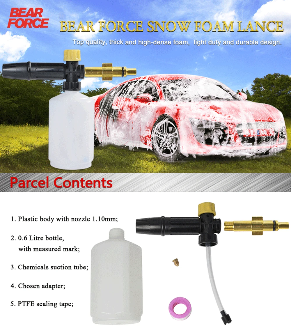 Пенная насадка для моек высокого давленияСодержимое посылки:1. Пенная насадка для снега, макс. 160 бар/2320psi2. 0,6 л бутылка, с отслеживанием объема работы калибровка линии3. Возьмите трубку4. Выбранный адаптер5. PTFE уплотнительная лентаСпецификация:1. Диапазон давления: 60 бар ~ 160 бар (900 фунтов на кв. дюйм ~ 2320 фунтов на кв. дюйм), идеально подходит для домашних моек высокого давления;2. Производительность вспенивания: богатый, плотный и Высокоплотный пенопласт, прочный светильник3. Материал: латунная насадка, нейлоновая крышка и HDPE бутылка.4. Ёмкость бутылки: 0,6 л5. Регулируемое потребление химикатов пены снега, изменяемый угол распыления от карандаша до вентилятора 60 °, устойчивый к химическим веществам.Эта насадка была специально разработана, чтобы включить все особенности латунной версии корпуса, за небольшую часть цены.1. Регулируемый распылитель2. Сетчатый фильтр из нержавеющей стали3. Регулируемый химический клапанНет в наличии в других местах в Китае только прямая сила fromBEARВажное примечание:Выберите подходящий адаптер для мойки под давлением. Пожалуйста, проверьте размер адаптера и убедитесь, что он подходит для вашей машины. Мы не несем никакой ответственности за несовместимость адаптера. Если вы не уверены, пожалуйста, свяжитесь с нами и отправьте нам фотографию вашего пистолета и копья, мы поможем выбрать подходящий адаптер.Дополнительные адаптеры (см. Размеры для справки ниже):A. Для Мойки под давлением серии Karcher K (материал адаптера: металл);B. Для Мойки под давлением серии Karcher K (материал адаптера: пластик);C. Для AR Blue Clean/ Black Decker / Michelin/некоторых Interskol/некоторых Greenworks/ Makita / Mac Allister/большинства моек высокого давления Bosch;D. Для Elitech/некоторых Interskol / YILI/некоторых Huter/некоторых Patriot/ Daewoo/ Bort / Pressure Joe / Sun Joe Мойка под давлением;E. Для Nilfisk / STIHL / HUSQVARNA / Gerni/некоторых моек под давлением Greenworks;F. Для Lavor/некоторых Hammer Flex/некоторых Interskol / Sterwins / Vax/некоторых чемпионов/мастеров/Briggs stratton Мойка под давлением;G. Для некоторых моек высокого давления Huter / Anlu / Kolner;H. Для некоторых Bosch (старых) / Greenworks US / Husky / Portland/некоторых молотков гибкого давления шайбы;I. Для Kranzle / BOSCH GHP/водяной пистолет с M22-Female мойкой давления;J.1/4 "Быстрый штекер, который является популярный соединитель в Северной Америке.(Отказ от ответственности: мы не являемся этими брендами или аффилированными с ними выше. Мы не продаем эти мойки высокого давления, но предлагаем некоторые совместимые части для них.)