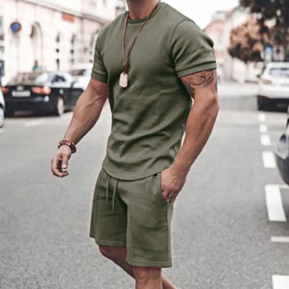 Мужской спортивный костюм из двух предметов, Однотонная футболка с коротким рукавом и шорты на шнуровке с карманами, спортивная одежда для фитнеса, лето 2021
