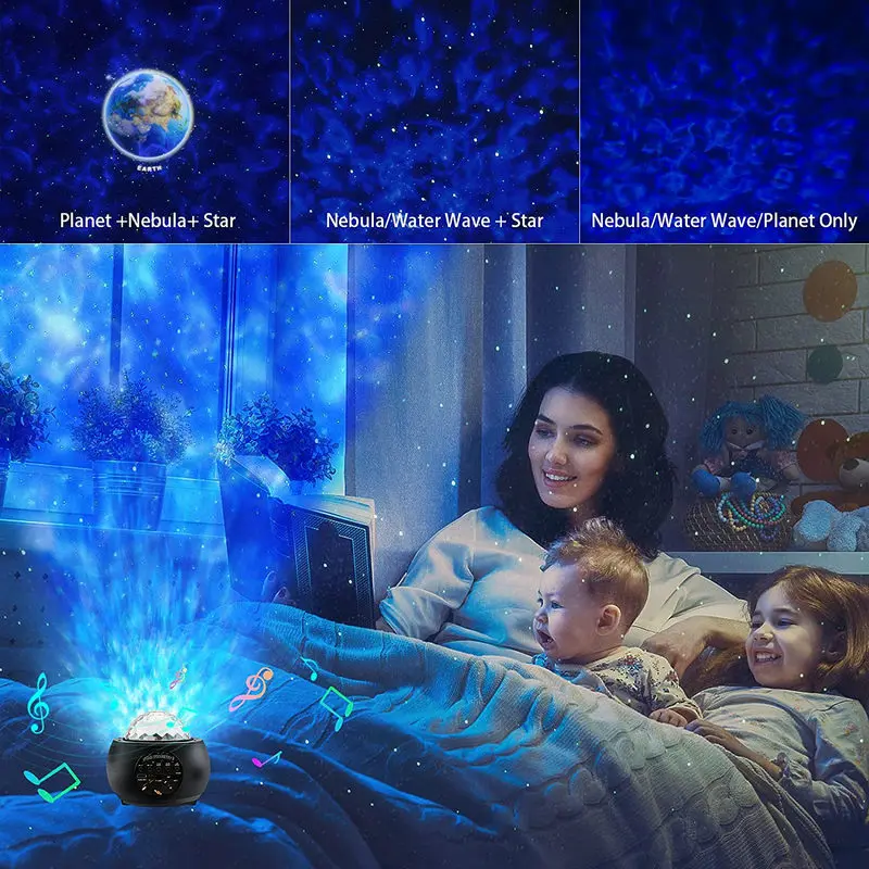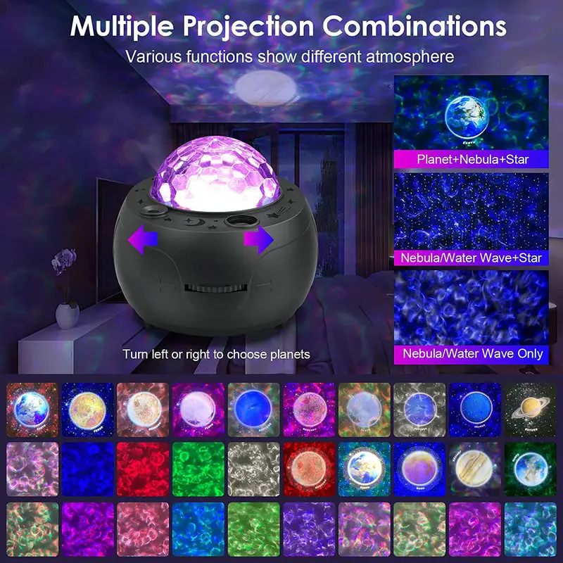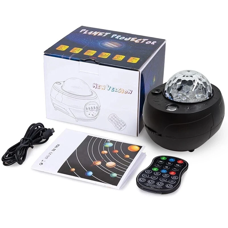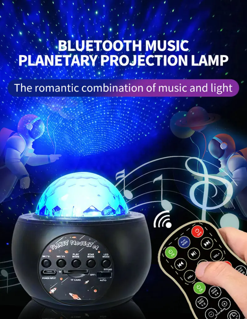 * Этот Звездный светильник-проектор относится к комбинации четырехцветных ламп с зернистой водой + зеленый лазер + 10 моделей с планетами. Водное зерно имеет четыре основных цвета: красный, белый, синий и зеленый, которые могут быть случайным образом в сочетании с 15 цветами. Цвет лазера Зеленый, и на нашей земле 10 узоров.* Профиль Bluetooth: любой мобильный телефон или другое bluetooth-устройство можно подключить, tf-карта может быть вставлена в корпус лампы или подключена к Bluetooth, чтобы воспроизводить музыку на мобильный телефон,* Функции дистанционного управления: лазерная яркость, водяная выкройка, узор Bluetooth, водная выкройка, одиночное управление лазером, единое управление планетой, голосовое управление, синхронизация, переключатель.* Корпус Лампы оснащен следующими кнопками управления: яркость корпуса лампы, громкость музыки, музыка вверх и вниз, пауза, выключение/включение Bluetooth, переключатель корпуса лампы, интерфейс USB.* Музыкальный светильник идеально подходит для семейных вечеринок, дней рождения, украшения для гостиной, светильник для сна и т. д.* 4 варианта времени: '1h/3h/5h/7h.* 5 уровень яркости регулируется: 20%/40%/60%/80%/100%.* 4 режима можно выбрать: Режим сна/автоматический режим/режим звука/режим Flasg.