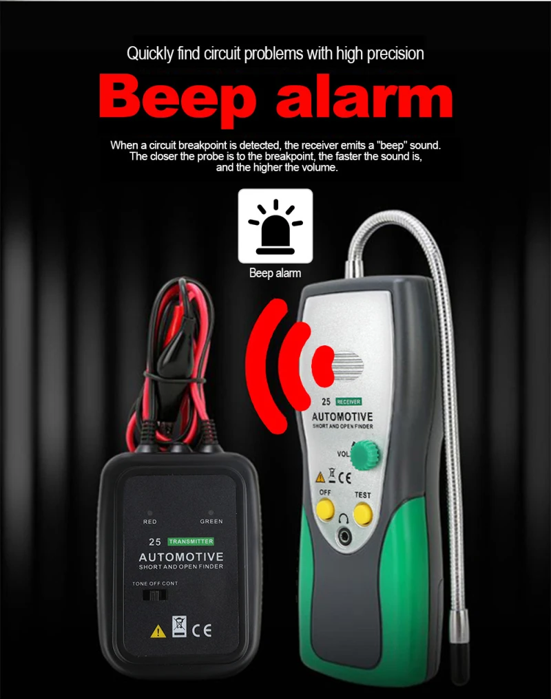 Простота в использовании: Просто подключите передатчик в серии с цепи или провода под тестом, (i. Е.: в месте выдувного предохранителя, через соединитель, в серии с открытым проводом, светильник с гнездом лампы и т. д.), И сканирование цепи/провода с помощью гибкого зонда для отслеживания неисправности