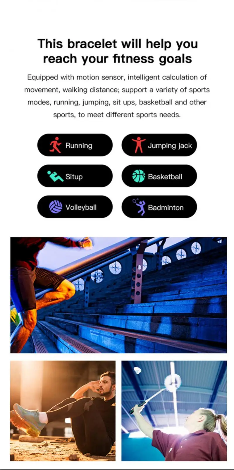Подсчет шагов, время упражнений, режим упражнений (сидения, бег, езда на велосипеде, бадминтон, настольный теннис, теннис, скакалка, Баскетбол), пробег упражнений, потребление калорий