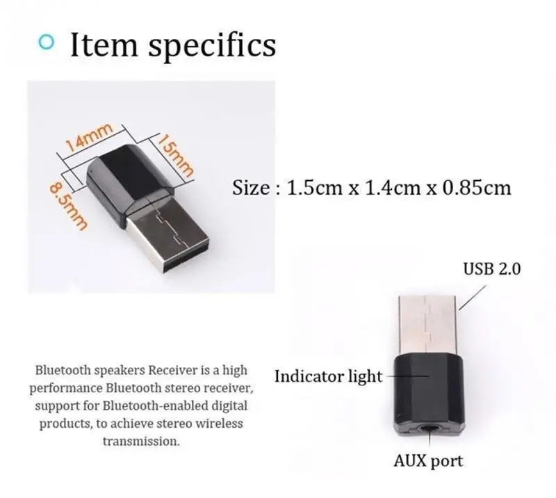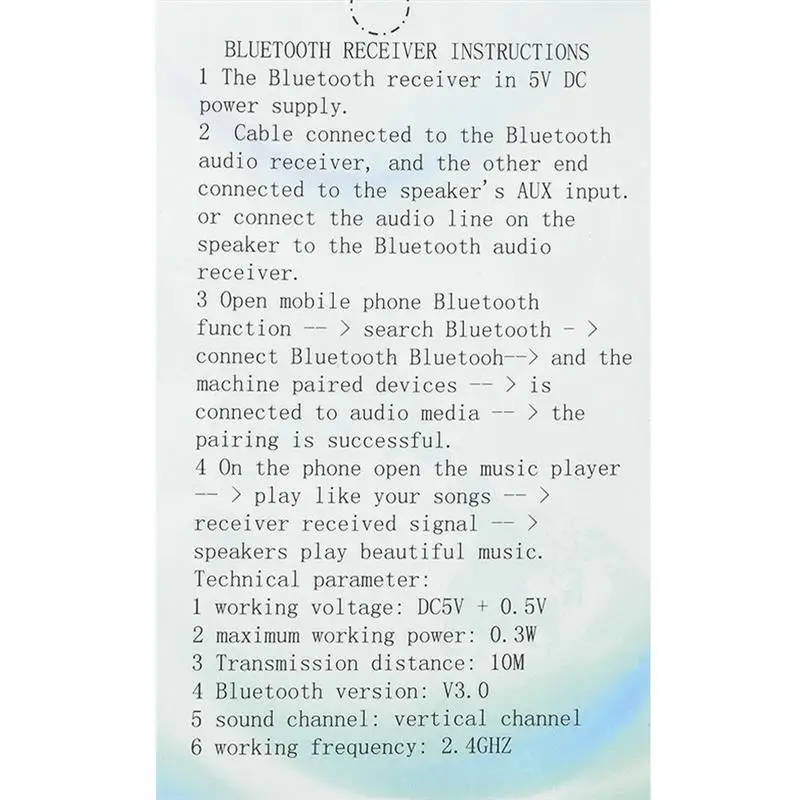 Точка пули:Сделайте ваше аудио развлечение (без Bluetooth) Подключитесь к любому bluetooth-смартфонуПосле подключения к смартфону, планшету вы можете слушать музыку, видео, игры через хорошие динамики/звуковую системуDC5V источник питания, подключение AUX / RCA аудио линии для работы, он не будет работать, если вы вставляете колонки с одним USB;Необходимо использовать свой собственный аудио кабель и источник питания USBКомпактный дизайн, вы можете взять его в любом месте.Описание:Рабочее напряжение: DC5V ± 0,5 VБольшая рабочая мощность: 0,3 WРасстояние передачи: ≧ 10 мВерсия Bluetooth: V3.0Звуковой канал: вертикальный каналРабочая частота: 2,4 ГГц