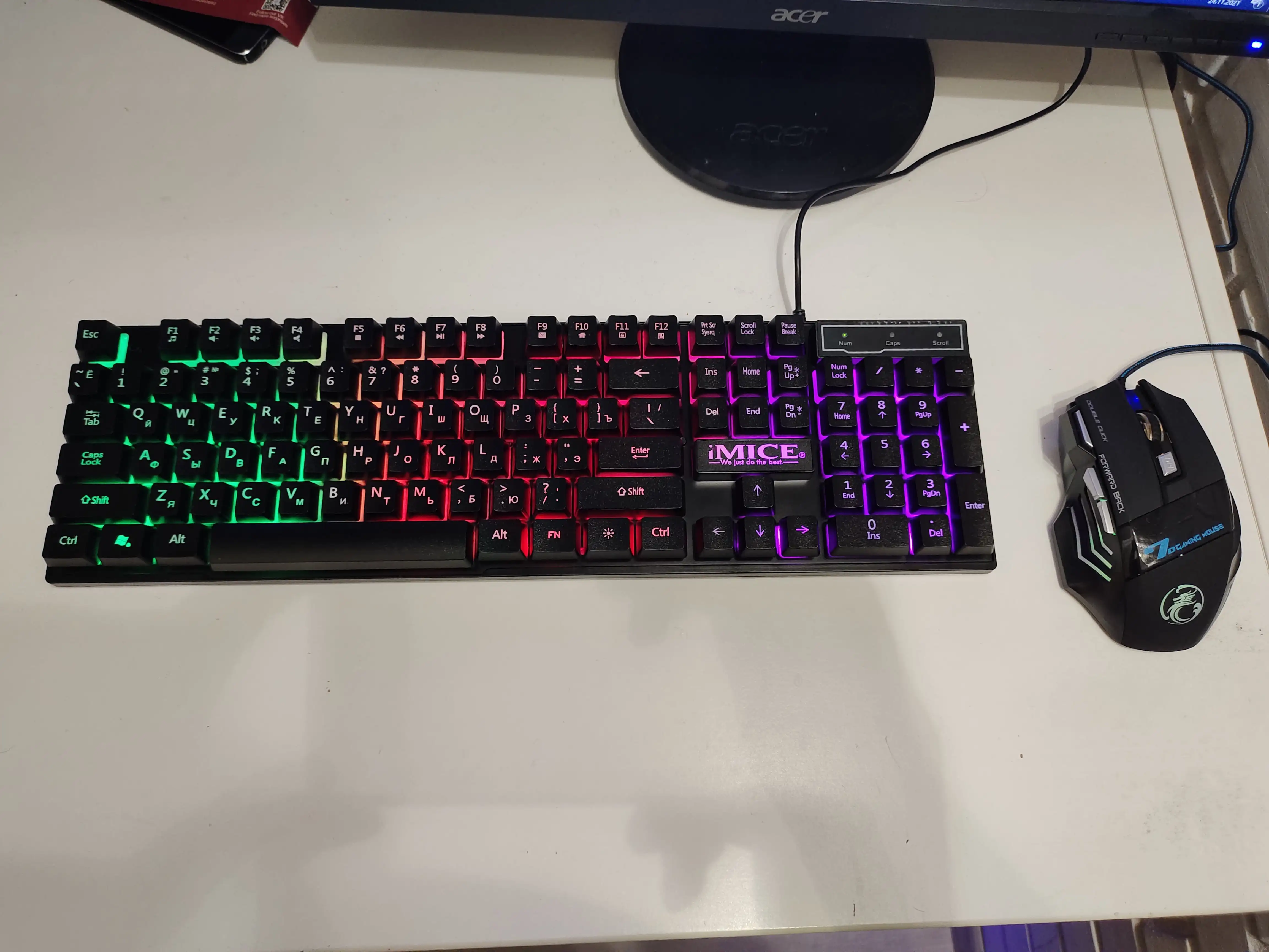 Товар приехал быстро. Упаковано хорошо. Повреждений нет. Ход клавиш клавиатуры и мышки тихий. Подсветка клавы статична, а вот у мыши переливается. У клавиатуры можно менять яркость. Мышь показалась не очень удобной. Наверное дело привычки. Зачем ферромагнит у входа USB мыши? Кабель мыши в тканевой оплетке. Выглядит добротно. За 900 рублей думаю достойно.