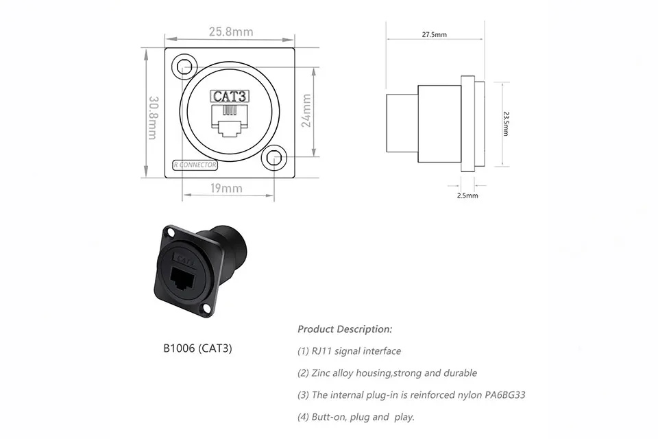 Особенности1. Наименование товара: разъем RJ452. Форма: соединитель шасси с креплением на панель3. Пол: женский4. Цвета: черный5. Посылка включает в себя: 4 шт.6. Настраивается: Да7. Применение: аудио и видео8. Статус: 100% новый и высококачественный