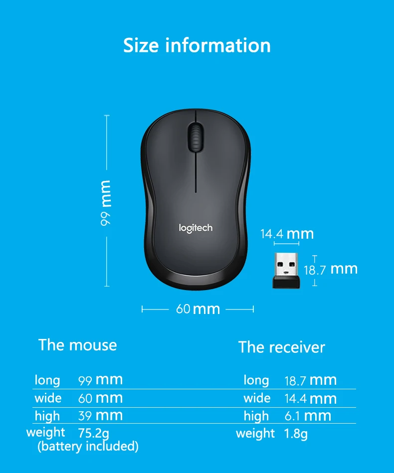 Бренд Logitech Series M220 Вес изделия 91 г Размеры изделия 60*99*39 мм, 75,2 г. Аккумулятор 1 AA (не входит в комплект) номер модели M220 цвет черный/синий/красный форм-фактор Ambidextrous питание батареи Описание батареи AA упаковка литиевые батареи не включены в материал