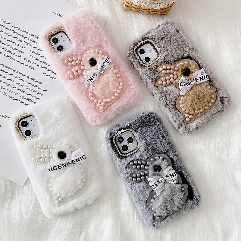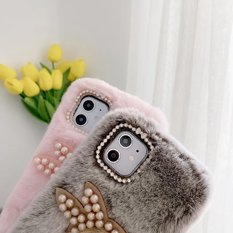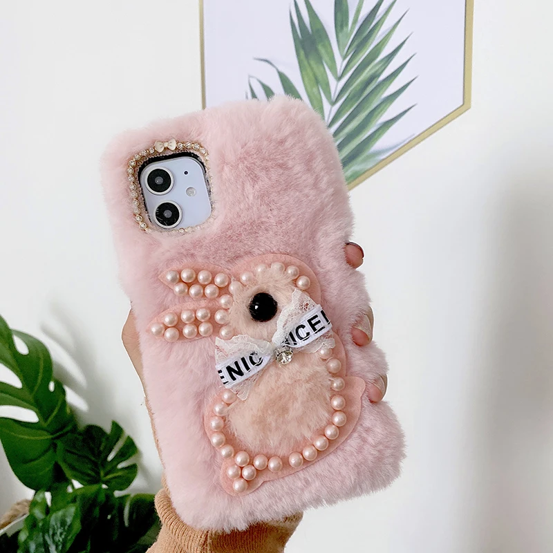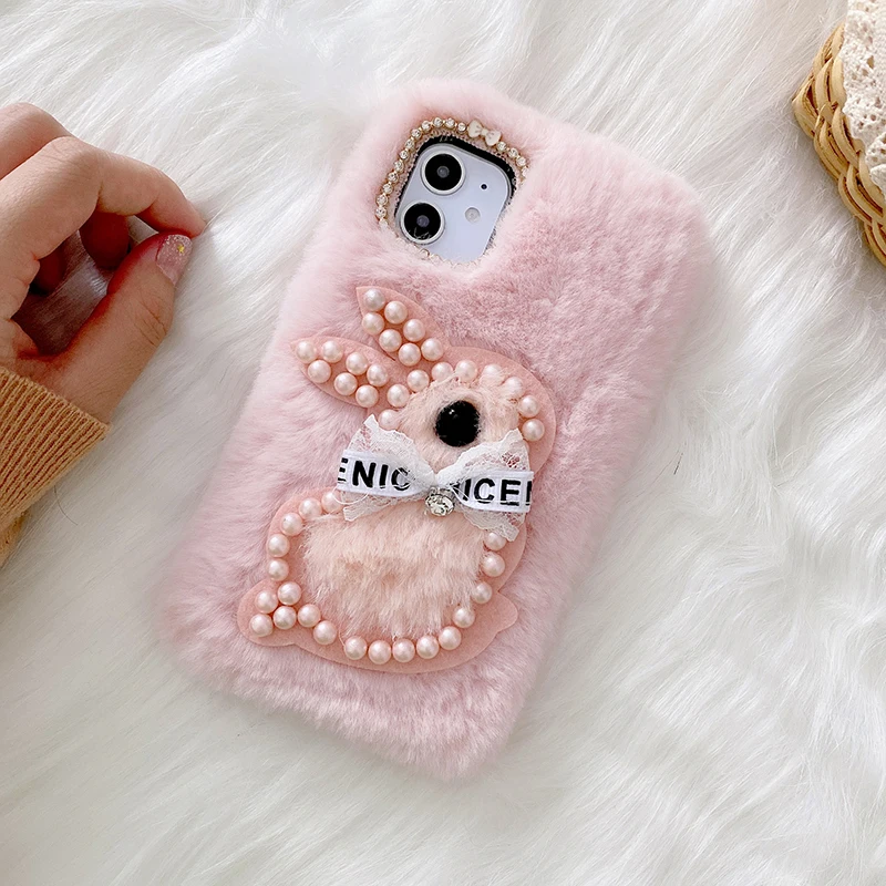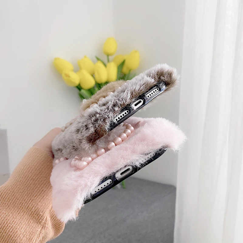 Милый пушистый чехол с жемчужным кроликом для iPhone 13 Pro Max 12 Mini 11 SE 2020 10X6 6s 7 8 Plus XR XS Max, плюшевый пушистый чехол для телефона