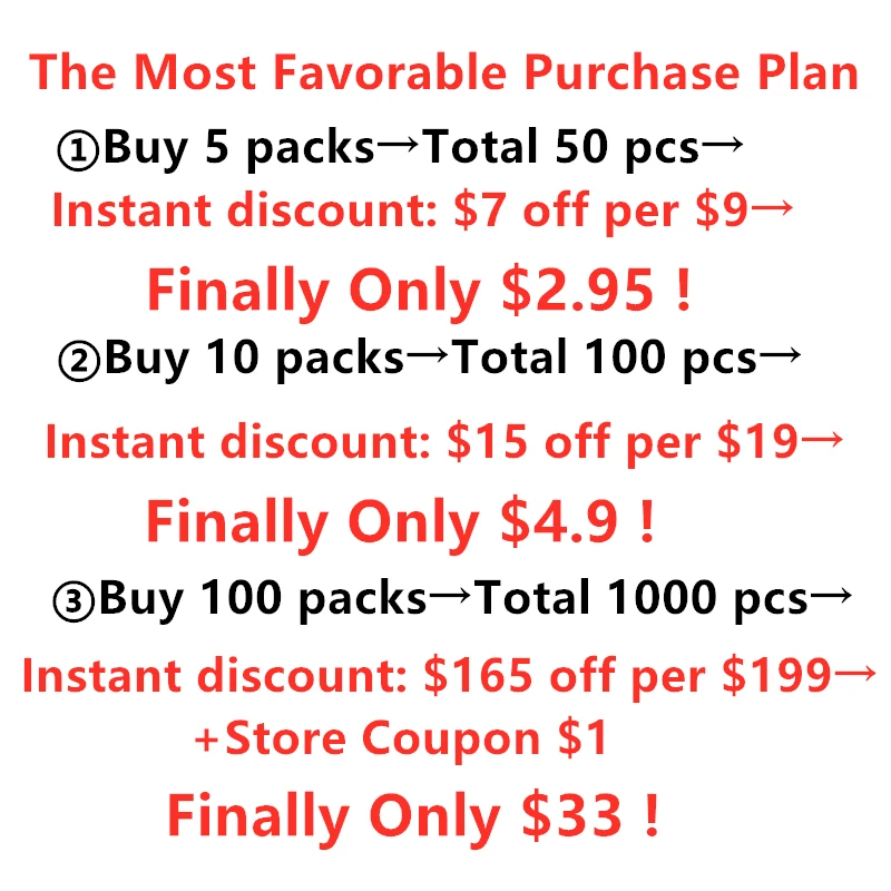 ①Buy 5 пачек → всего 50 шт. → мгновенный Скидка: $7 за $9 → наконец-то только $2,95!②Buy 10 упаковок → всего 100 шт → мгновенный Скидка: $15 Выкл в $19 → наконец-то только $4,9!③ Купите 100 упаковок → всего 1000 шт → мгновенная Скидка: $165 за $199 + купон на магазин $1 →, наконец, только $33!