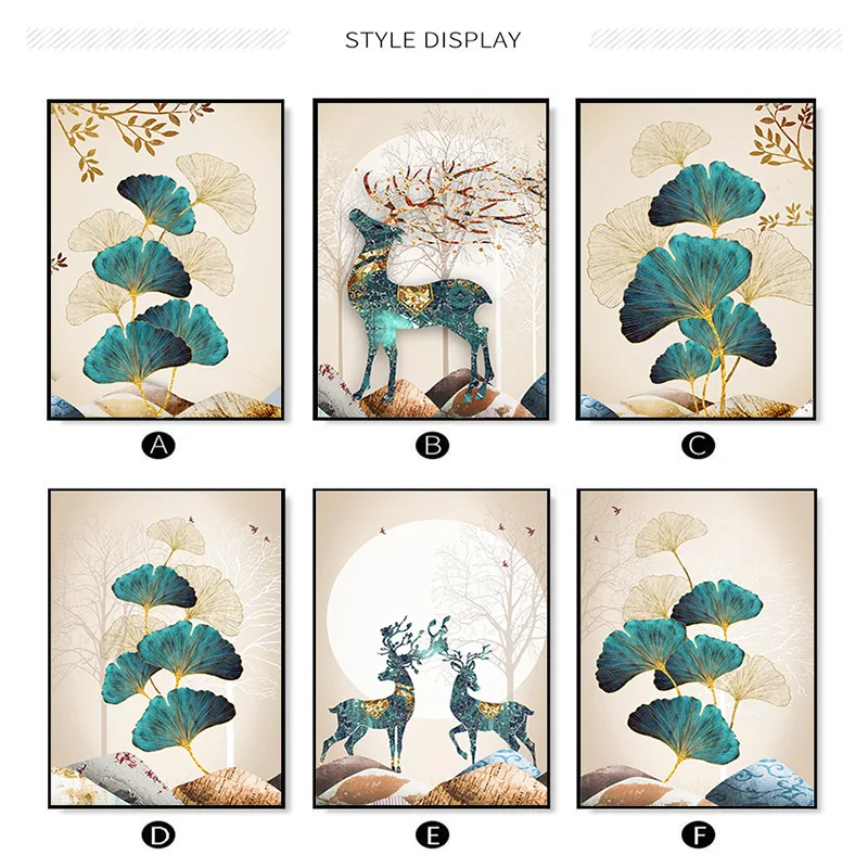 Абстрактные Роскошные плакаты с листьями гинкго, цветами, с оленем и принтами, настенная живопись, зеленая картина для гостиной, домашний декор, картина