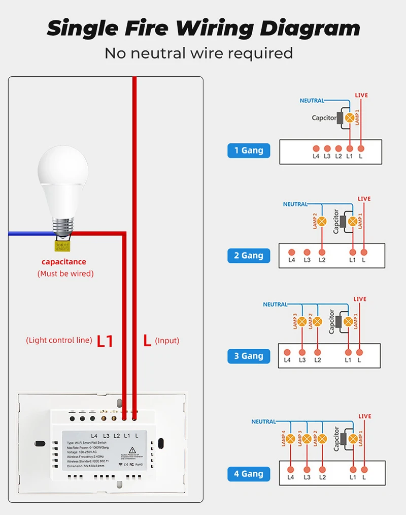 【Нет нейтральных требований 】: установка проще и подходит для большего количества семей. Но вам нужно установить конденсатор на лампе L1