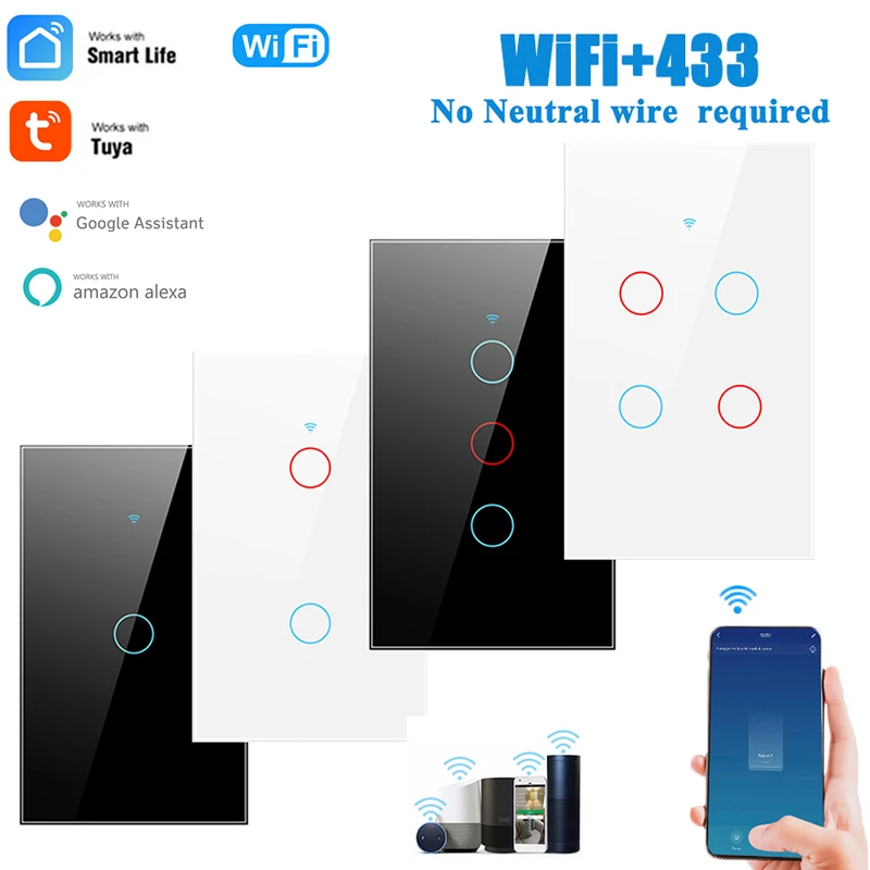 Умный светильник ель света Tuya Wi-Fi RF433, 1234 кнопок, США, Бразилия, без нейтрального провода, сенсорная настенная панель из закаленного стекла, работает с Alexa Google