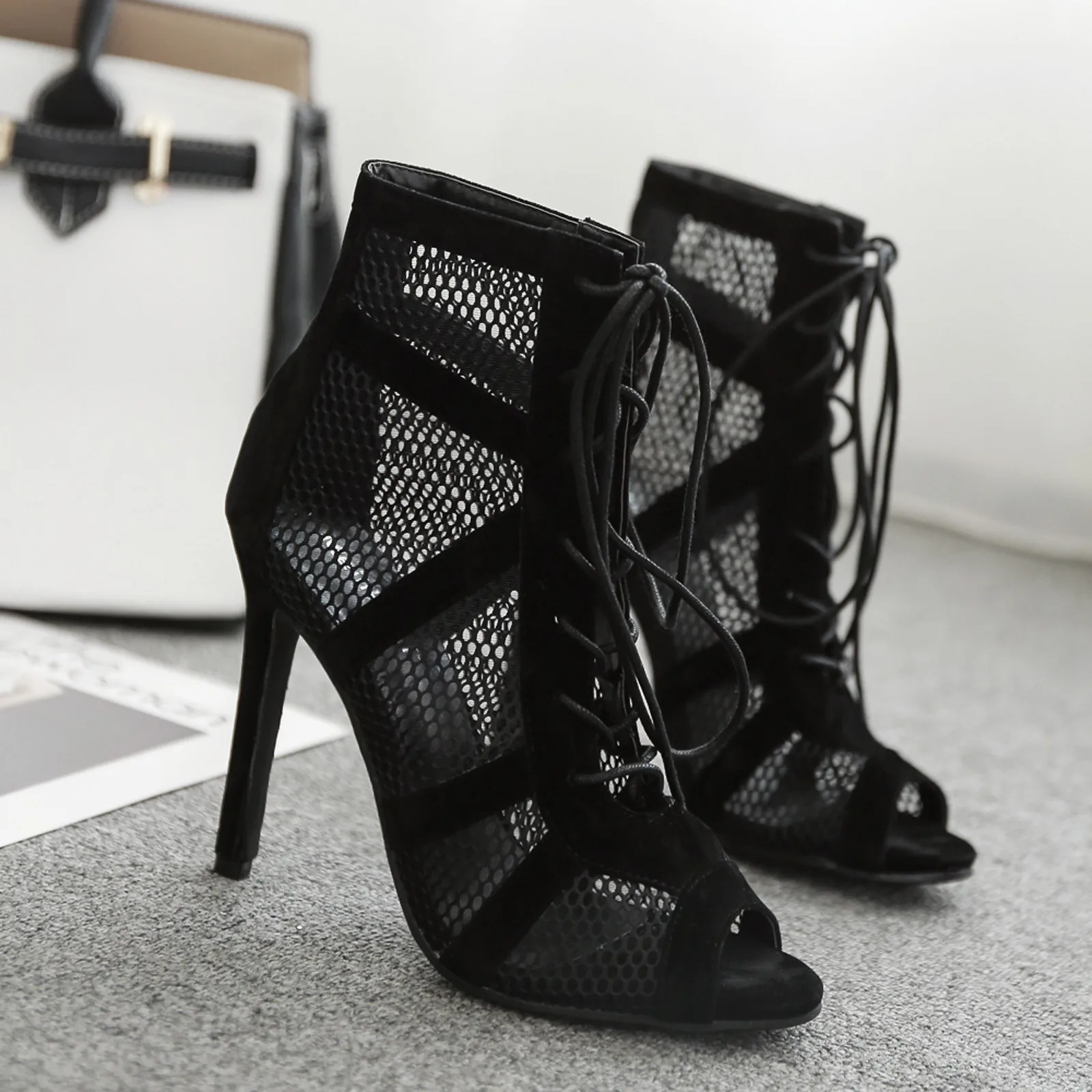 Женские черные босоножки, сандалии с сетчатыми перекрестными ремешками, босоножки на высоком каблуке-шпильке с открытым носком, шнуровкой и перекрестной шнуровкой, Классическая обувь #