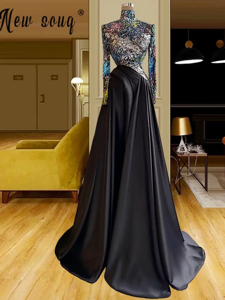 Вечернее платье с высоким воротом, длинным рукавом, черное, в мусульманском стиле, блестящее, для выпускного вечера