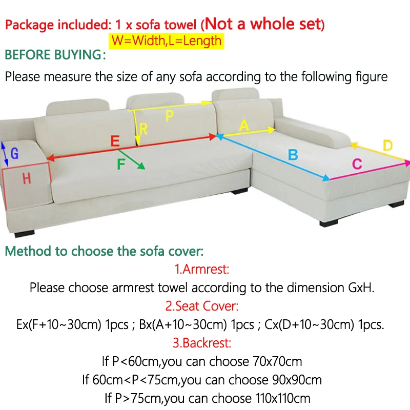 Способ выбрать чехол для дивана: 1. Подлокотники:Пожалуйста, выберите полотенце для подлокотника в соответствии с размерами GxH. 2. Чехол для сиденья:Ex(F + 10 ~ 30 см) 1 шт.; Bx(A + 10 ~ 30 см) 1 шт.; Cx(D + 10 ~ 30 см) 1 шт. 3. Спинка:Если р <60 см, вы можете выбрать 70x70 смЕсли 60 см