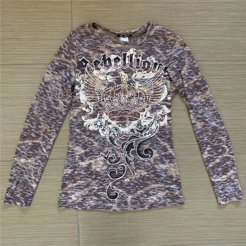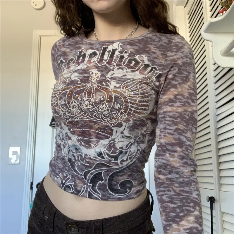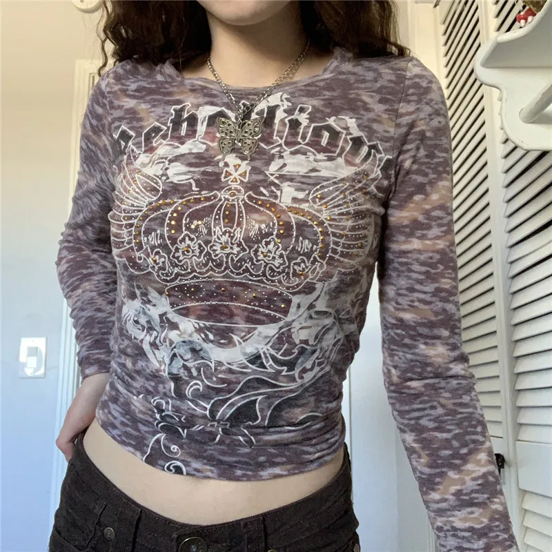 Женская Винтажная Футболка с принтом короны Xingqing Y2K, Осенний Топ, тройник в эстетическом стиле, пуловеры со сказочным сердечником