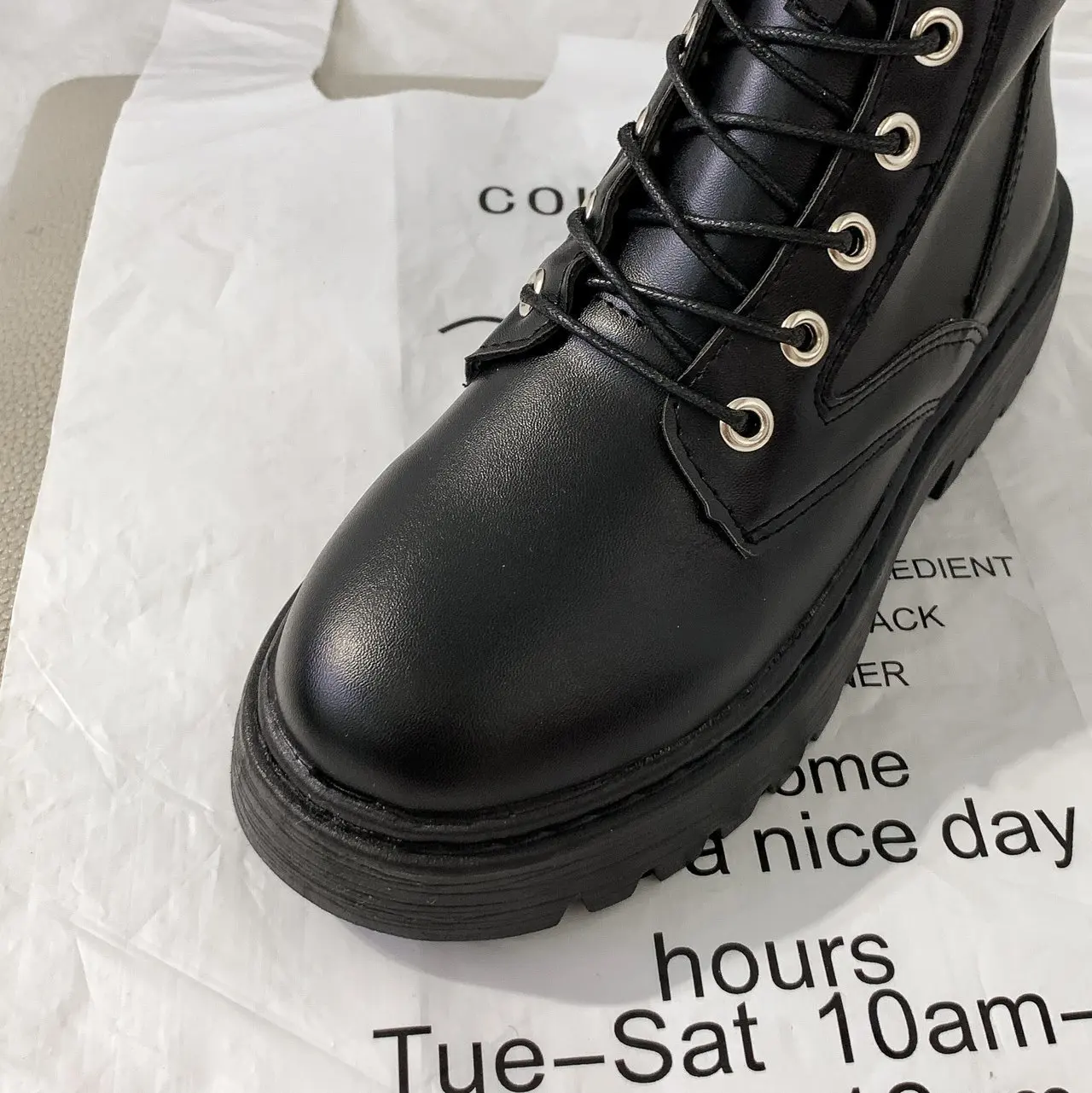 Черные кожаные женские ботинки из ПУ кожи, Осенние Зимние круглые б...