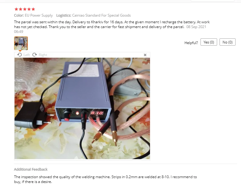 Emballage OK. Temps de livraison un peu long COVID-19 oblige. Excellente petite soudeuse très simple à utiliser. Les bandes de nickel fournies sont ok aussi. Mes deux packs d'accus Li-ions ont remplacés les vieilles batteries Ni-Cd de ma visseuse. Pensez à porter des lunettes de protection, à faire untest avant et ne pas mettre trop fort : je suis resté sur 4 pour mes accus.