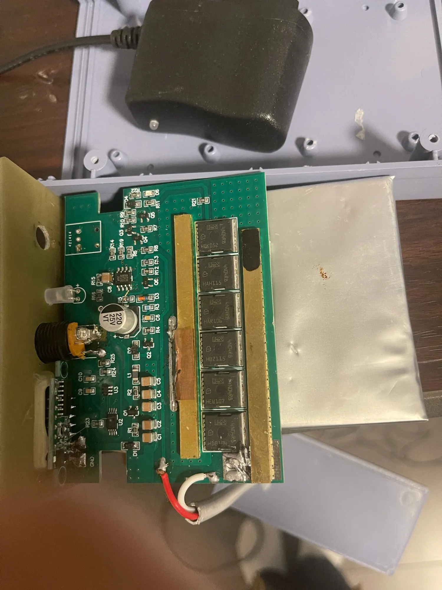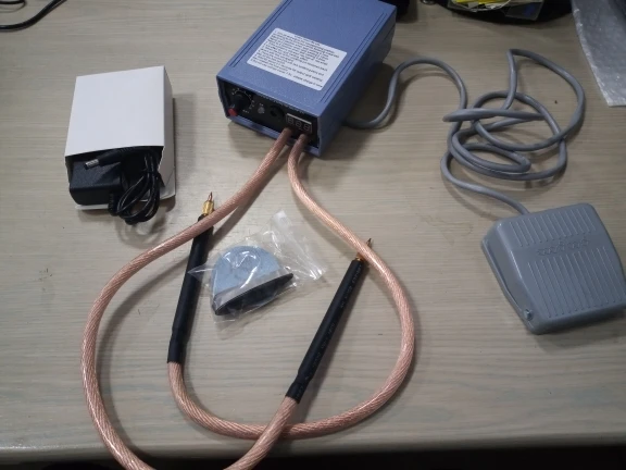 Аппарат выполнен качественно. Работает от двух литий-полимерных аккумуляторов, соединенных последовательно. В комплекте отдельная зарядка на 8.4 вольта. Варит хорошо. После нажатия педали через полсекунды дает один импульс. Ленту 0.2 сваривает так, что не оторвать. На передней панели есть индикатор напряжения аккумулятора и ручка регулировки мощности импульса. На верхней панели имеется подсказка.