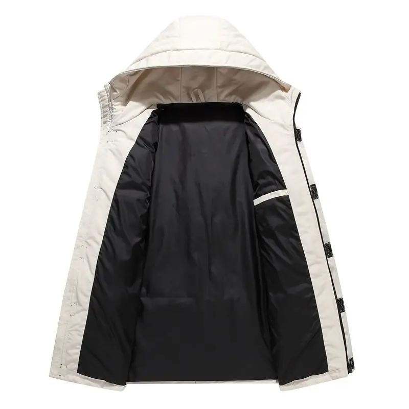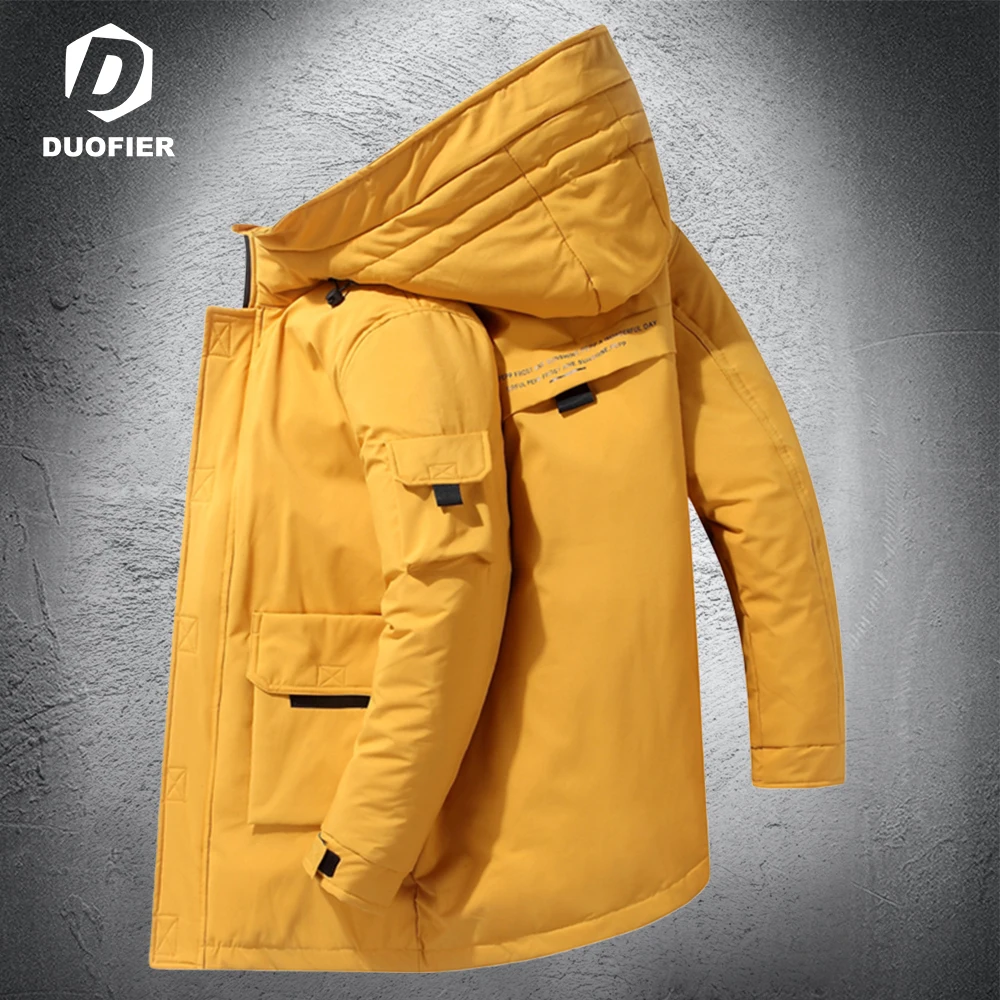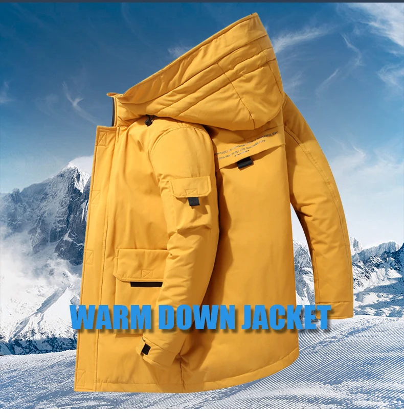 Новинка Зима 2022, мужской повседневный пуховик с капюшоном, желтая Толстая Теплая мужская одежда, длинное пальто на белом утином пуху, модные парки с шапкой