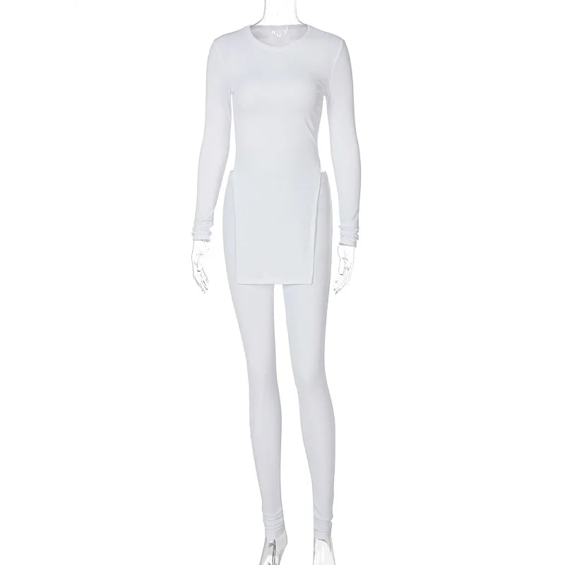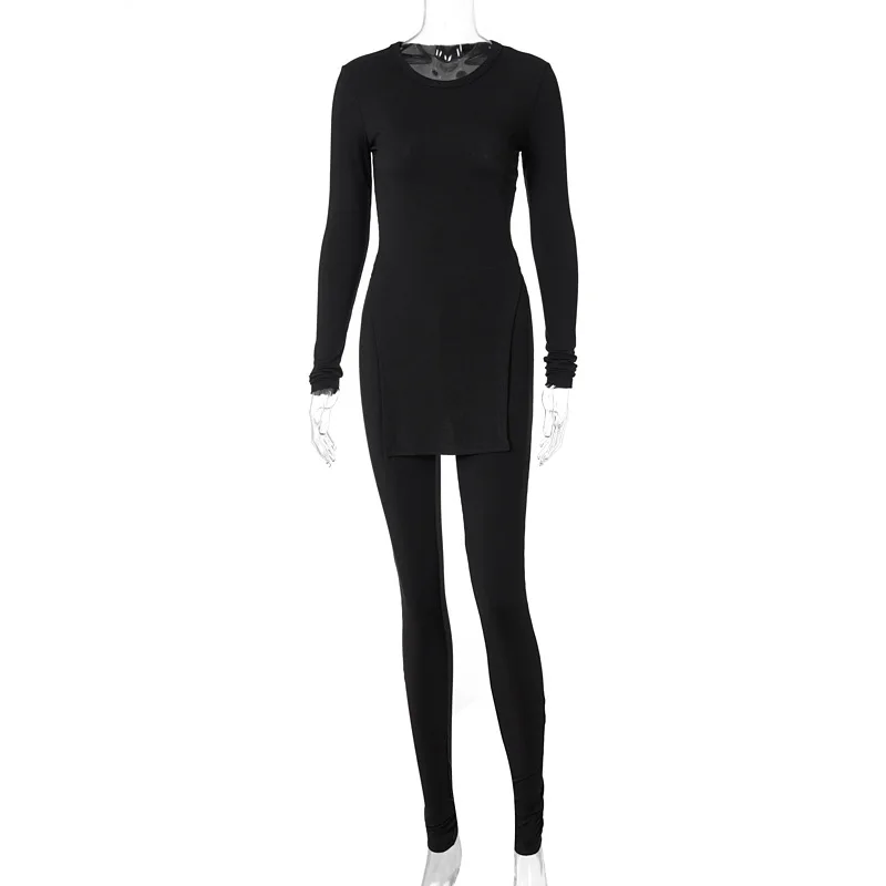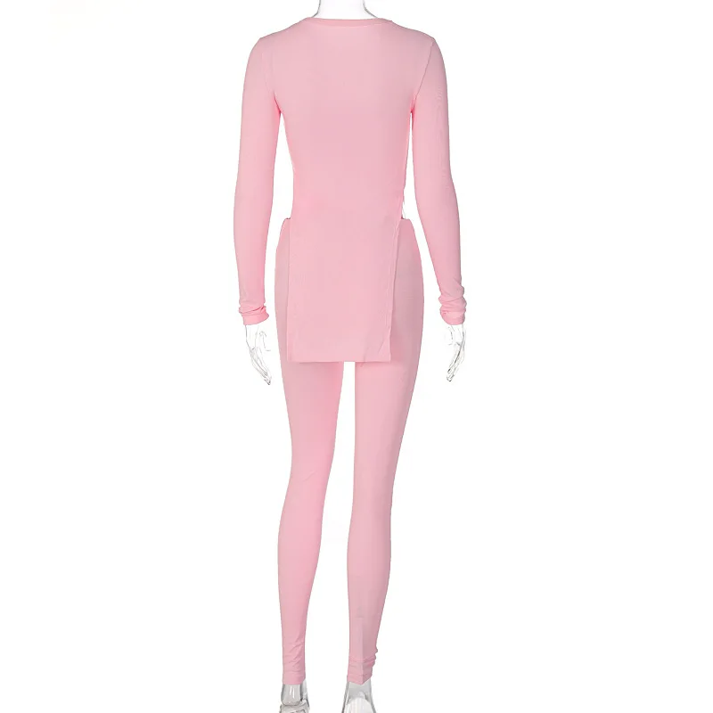 Облегающий комплект из 2 предметов для женщин, Топ с длинным рукавом и брюки с разрезом, Женский вязаный костюм в рубчик, зимние спортивные костюмы, повседневная домашняя одежда