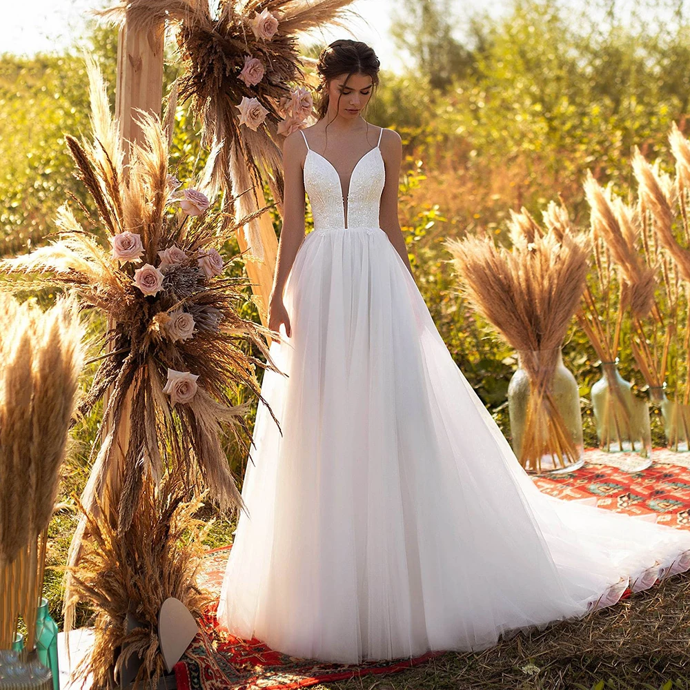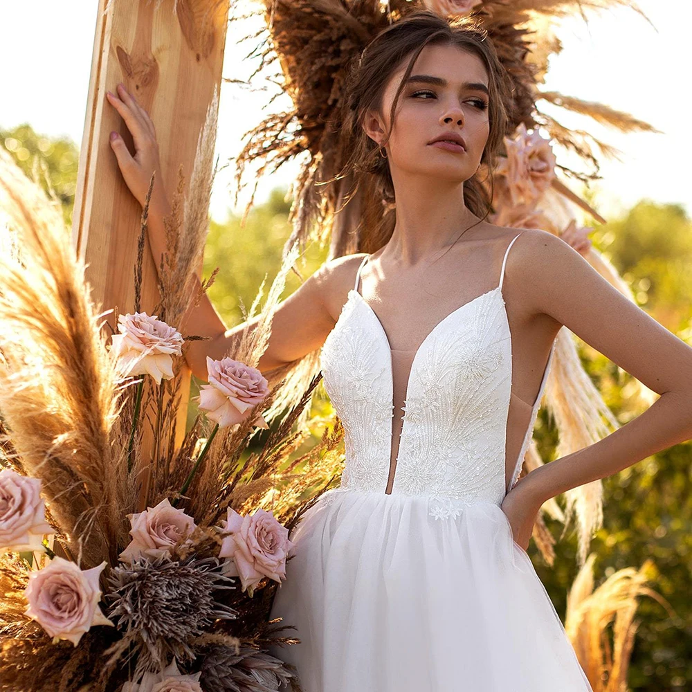 Женское свадебное платье с открытой спиной, на тонких бретелях, с глубоким V-образным вырезом