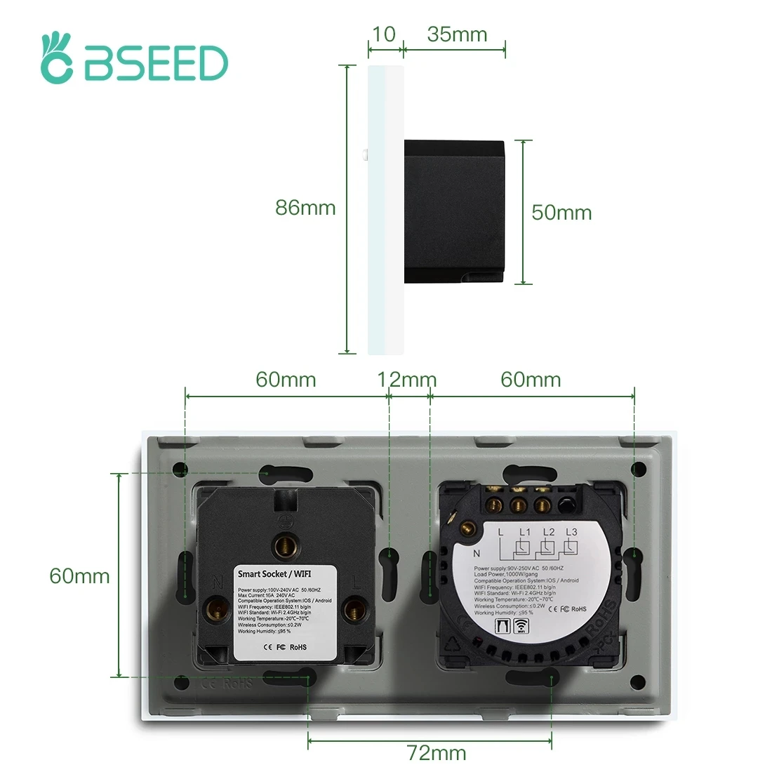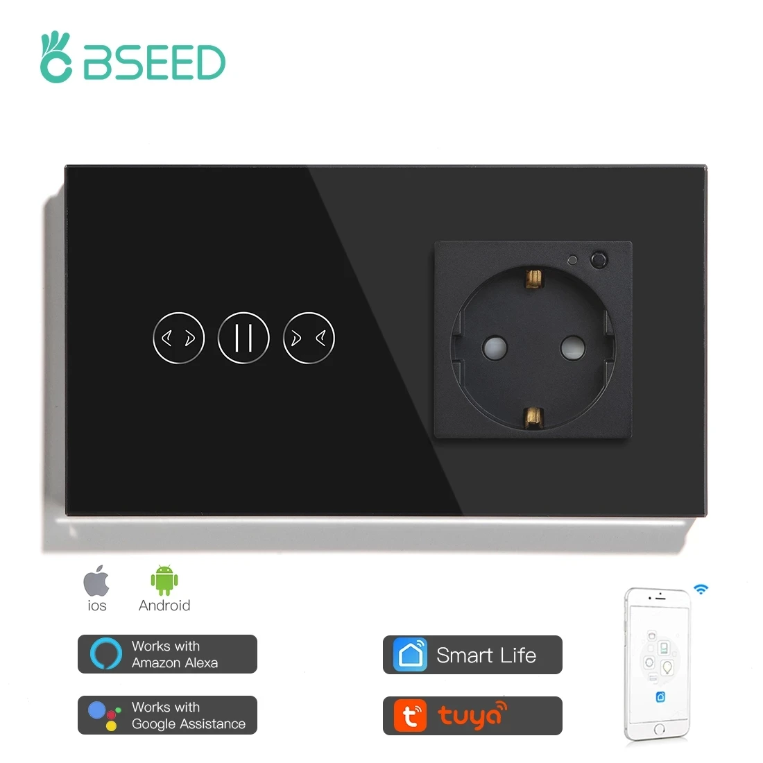 Сенсорный выключатель для штор BSEED с Wi-Fi и евророзеткой, стеклянная панель с белыми и черными кристаллами, смарт-жизнь, голосовое управление Alexa Google