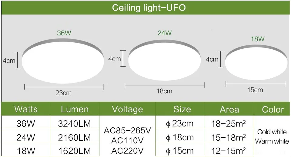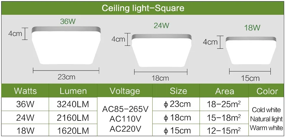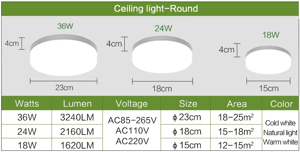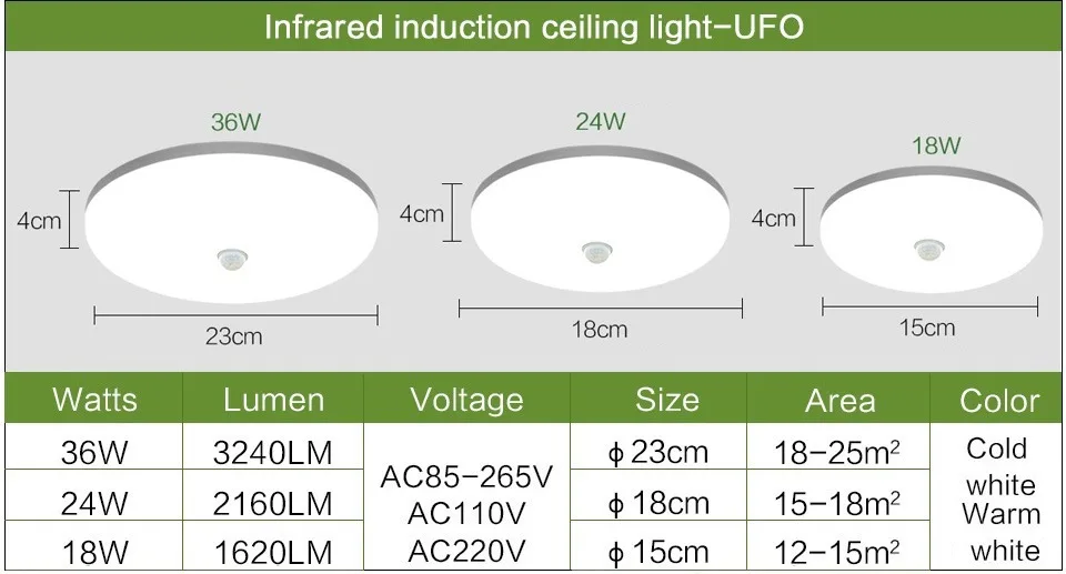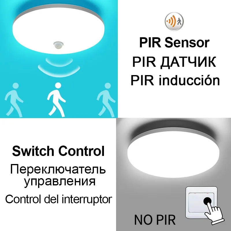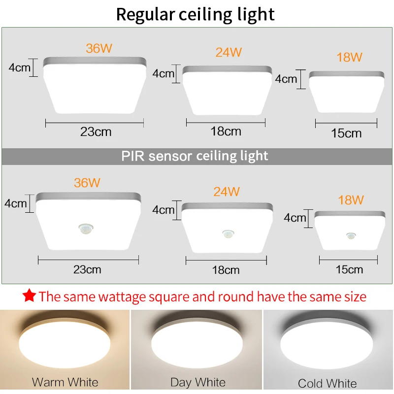 -Напряжение:AC85-265V-Мощность:18 Вт/24 Вт/36 Вт-Особенности:PIR сенсор/без PIR-Материал:ПК + ABS-CRI:Около 80-Эффективность освещения:Выше 90-Гарантия:1 год
