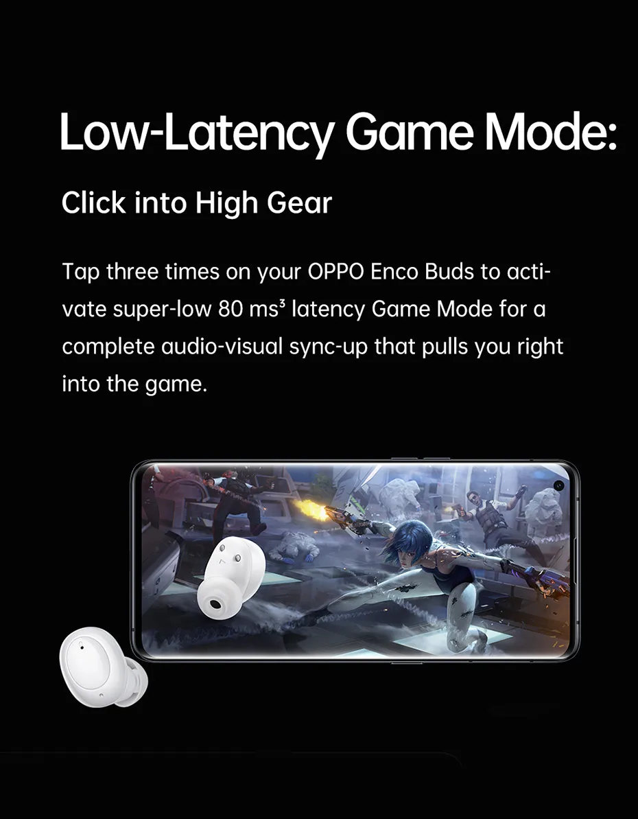 Нажмите три раза на свой OPPO Enco Buds, чтобы активировать режим супер-низкой задержки 80 м³ для полного аудиовизуального