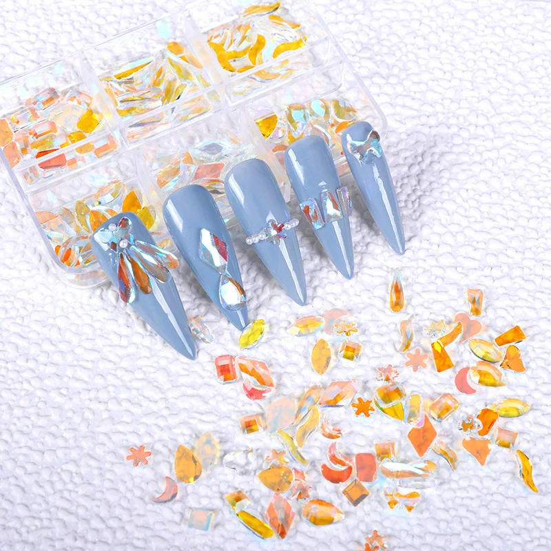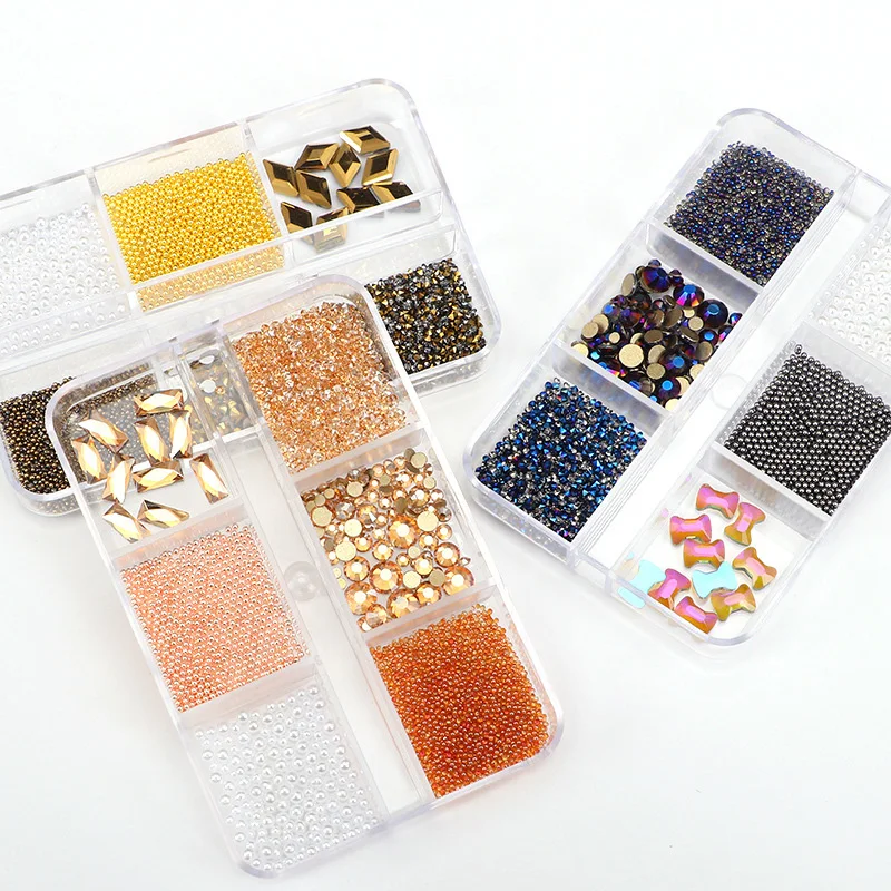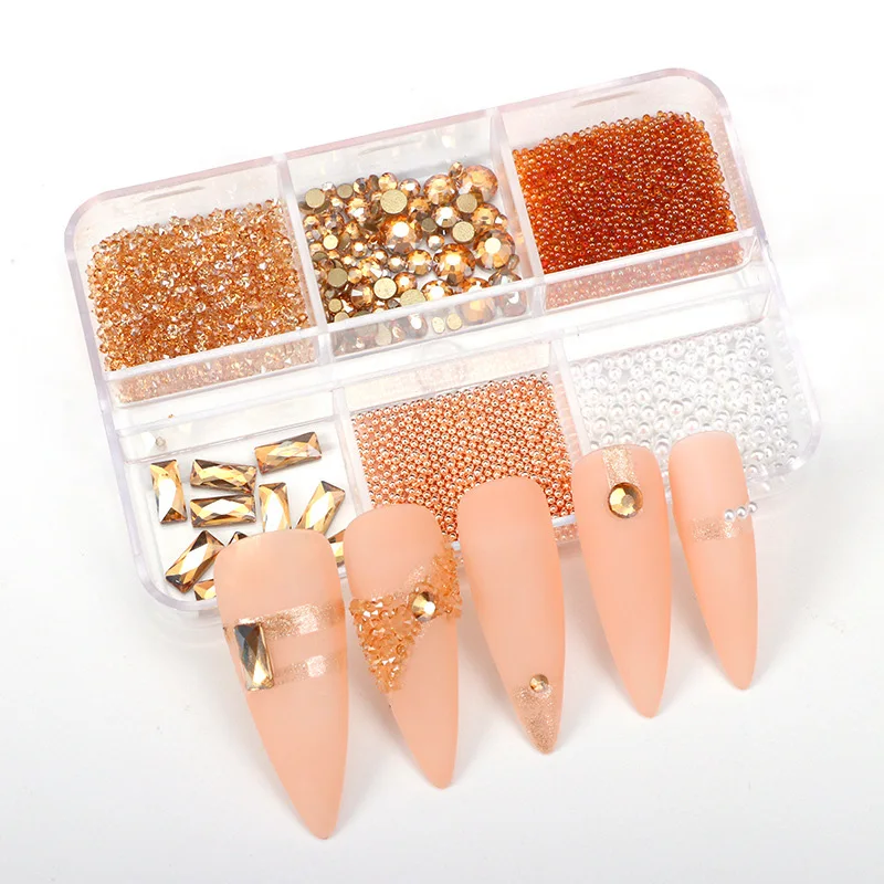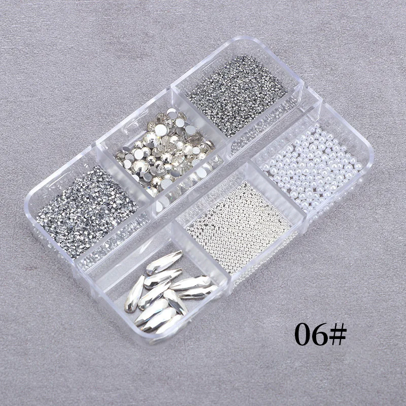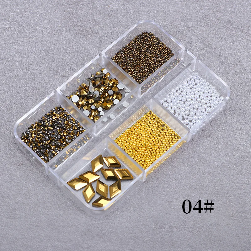 6 ячеек в коробке, кристаллы, стразы для дизайна ногтей, Металлические Мини-бусины из нержавеющей стали, серые, розовые, золотые маленькие гвозди с микро-икрой, 3D декор