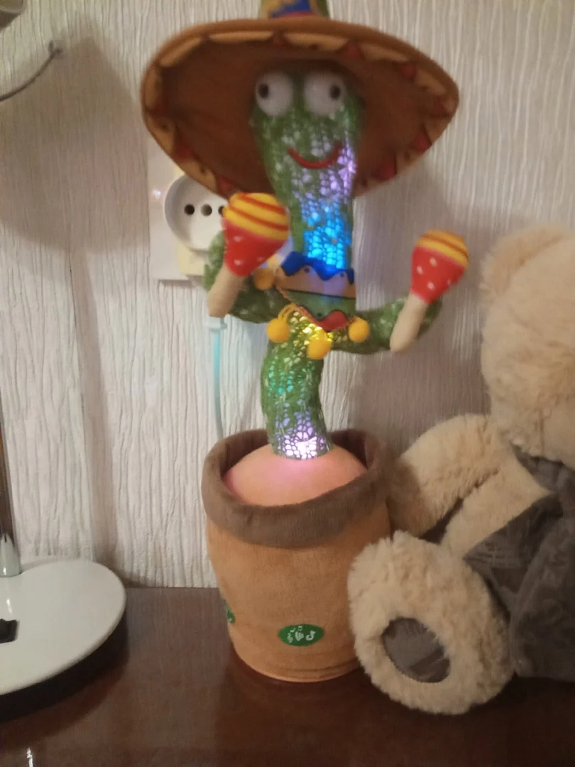 Очень классный кактус! Играет хорошо, повторяет, танцует, светится! Малышка в 6 месяцев заинтересовалась, спасибо продавцу!