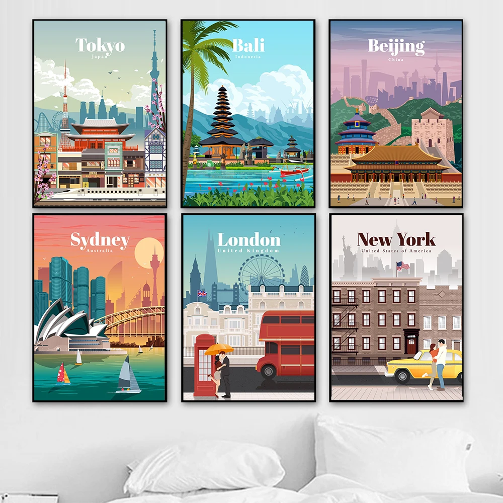 Постер для путешествий с известным городским пейзажем из мультфильма Лондон Нью-Йорк Бали Токийский пейзаж Картина на холсте настенные картины для гостиной домашний декор
