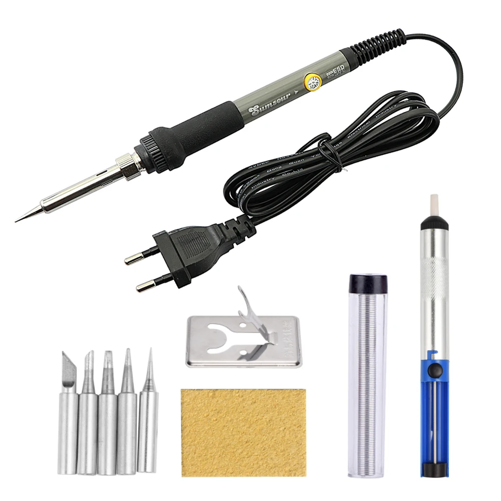 1X60 Вт паяльник (110 В штепсельная вилка США/220 В штепсельная вилка европейского стандарта)5 шт. наконечники паяльника (I / B / K /2.4D / 3C)1 шт. подставка для пайки из нержавеющей стали1 шт. губка