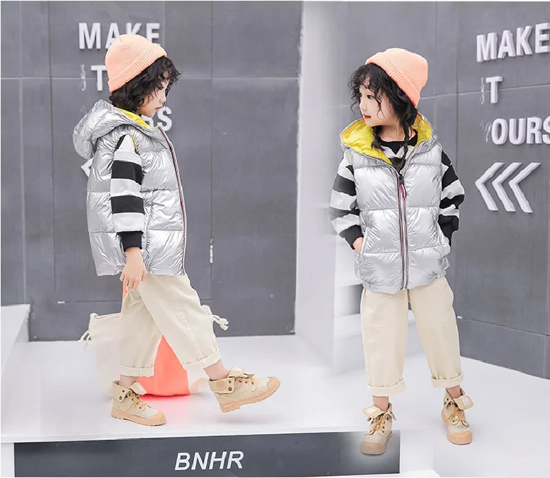Детский жилет, верхняя одежда, новые зимние пальто без рукавов, детская одежда, Теплый Блестящий пуховой жилет для маленьких мальчиков и девочек