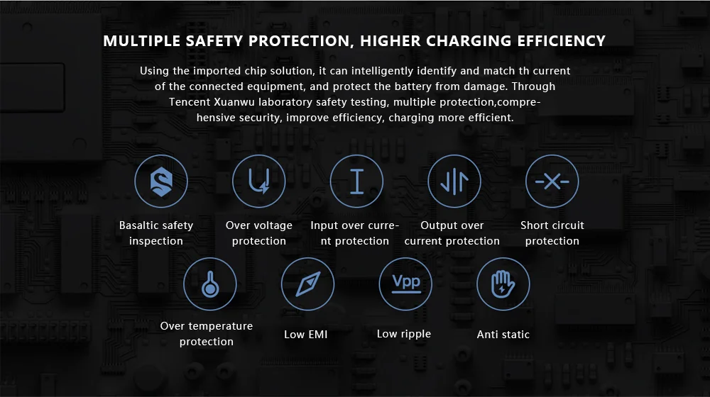 Используя импортированный чип, он может интеллектуально идентифицировать и соответствовать току подключенного eauipment, а также защитить батарею от повреждений. Благодаря tencent Xuanxu лабораторным испытаниям безопасности, многократной защите, надежной безопасности, повышения эффективности, более эффективной зарядки.