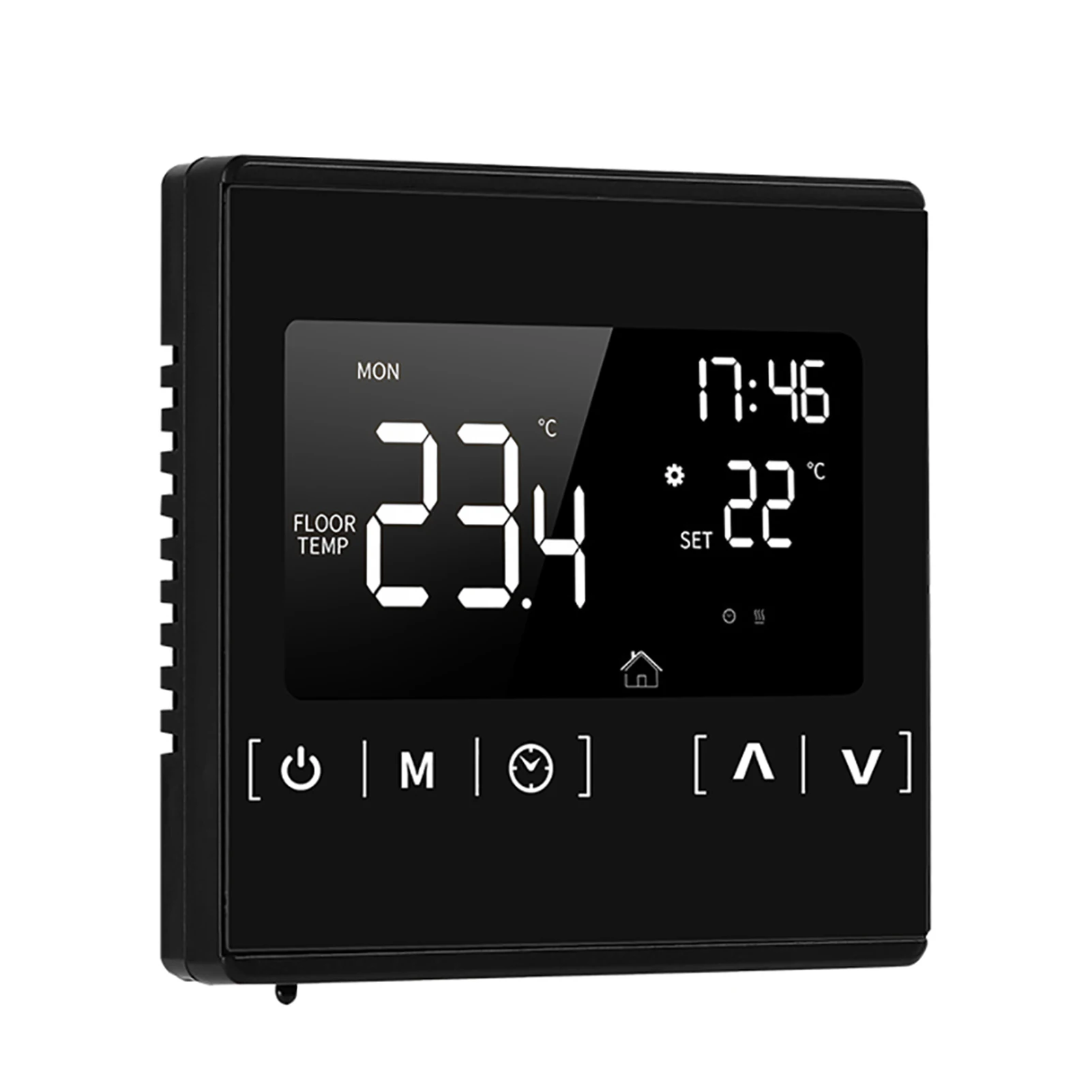 Этот цифровой термостат для напольного отопления использует передовое микрокомпьютерное управление чипом и высокоточный датчик для контроля температуры электрических нагревательных устройств. Управляйте моторизованным шаровым клапаном, моторизованным клапаном, тепловым клапаном, электромагнитным клапаном, нагревателем, электрической нагревательной пленкой и электронагревательным углеродным кристаллом. В основном используется для напольного отопления.Особенности:Термостат с подогревом сенсорного экрана, прост в установке и использовании и удобно сочетается с вашим стилем жизни.Программируйте его на основе вашего графика, чтобы сократить ваши счета за электричество. Гибкие программируемые сроки: 5-2 дня или 6-1 день.В состоянии выключения, функция анти-замерзания при низкой температуре будет автоматически включаться, когда он будет ниже 5 ℃; И защита от перегрева начнется, когда он будет более 7 ℃ для защиты пола.Ручной режим и программируемый режим можно выбрать с 3 метровым внешним датчиком.6 режимов программируемой функции для контроля температуры и времени. Доступны часы и минуты.Функция блокировки клавиатуры для предотвращения неправильного использования детьми.Функция памяти при отключении питания Защитите настройки от сбоя питания.Характеристики:Цвет: черный/белый (по желанию)Материал: Огнестойкий поликарбонат + АБС-пластикВходная частота: 60 ГцВходное напряжение: 85-250 В переменного токаДатчик температуры: термометр NTCТочность контроля температуры: ± 1 ℃Потребляемая мощность: <1 ВтТок нагрузки: 16AКлюч: сенсорное управлениеНастройка температуры: от 5 до 50 ℃Диапазон измерения температуры: -9 ℃ ~ 99 ℃Дисплей: 71*40 мм ЖК-дисплейРасстояние между установленными отверстиями: 60 ммПодходящий Размер коробки: 86*86 ммРазмер изделия: прибл. 86*86*45 мм/3,4*3,4 * 1.77inВес изделия: прибл. 135g/4,8 ozРазмер посылка: прибл. 10,4*10*8 см/4,1*3,9 * 3.1inВес посылка: прибл. 277 г/9,8 унцийУпаковочный лист:1 * термостат для подогрева пола1*3 метра кабель внешнего датчика2 * крепежные винты1 * Руководство пользователя (на английском и русском языках)Примечание:Для установки термостата необходимо подготовить распределительную коробку на стене, подходящий размер 86*86 мм. И расстояние установки 60 мм.