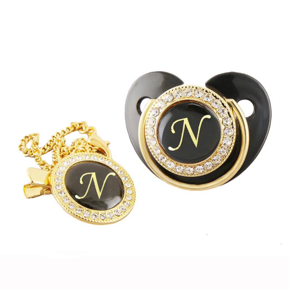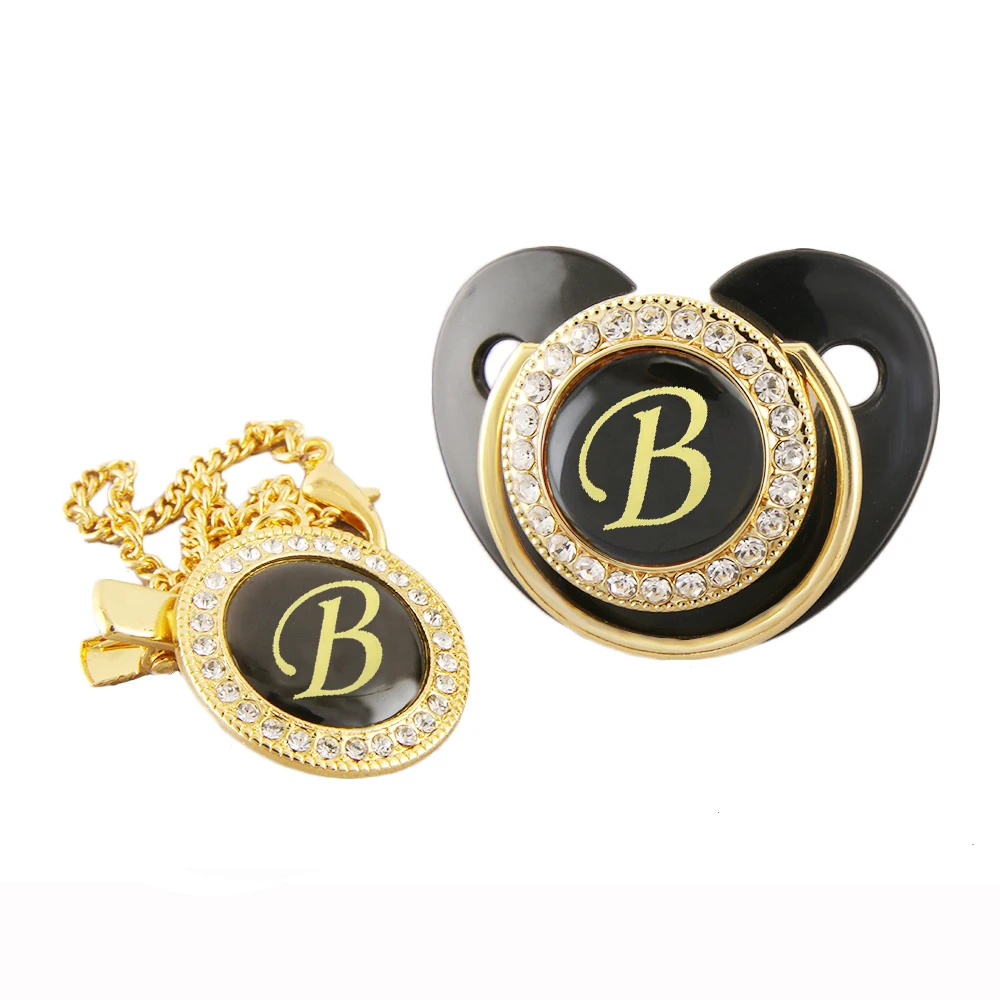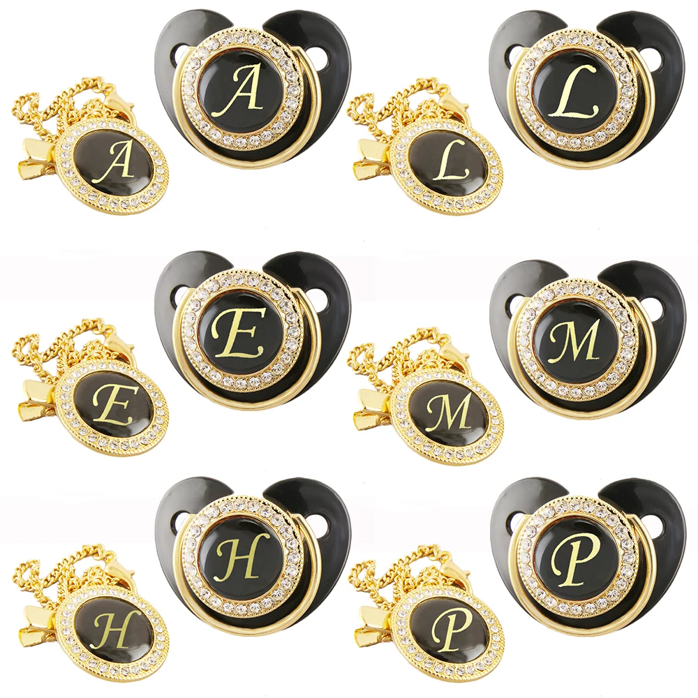Роскошная Черная блестящая детская пустышка с цепочкой и золотым буквенным принтом, уникальный 26 именных инициалов, подарок для детского душа, Прямая поставка