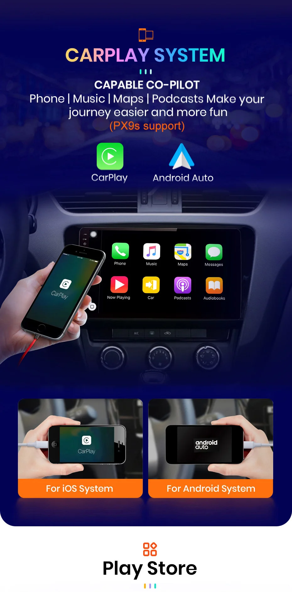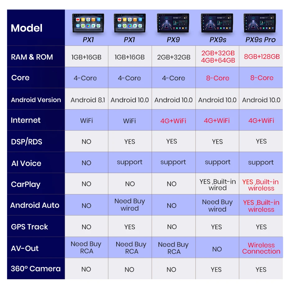 1). Устройство должно выполнить поиск по спутнику правильно в первый раз, затем вы можете обновить время,2). Десять, учитывая, что система и приложения preinstaladas formarn часть памяти; Если она установит карту России займет около 3 Гб; Если она установит карту Европы, система займет около 7 Гб;1. Как использовать автомобиль CarPlay и Android?CarPlay:Оба провода и могут быть подключены только к 4-контактному usb-порту (с 4 небольшими отверстиями), затем нажмите на приложение «Phonelink» или «Tlink» на радио;Android авто:После покупки кода активации персонал службы поддержки клиентов отправит вам способ операции и код активации2. Как настроить рулевое колесо управления?1) Если нет canbus, выполните следующие действия① 1 + 16 Гб: значок управления конфигурацией Clik, как показано на изображенииHttps:/Https② PX9: значок управления Clik, как показано на изображенииHttps:/Https③ PX9S/PX9S pro: настройки → swswc информация о автомобиле, как показано на картинкеHttps:/Https2) Если в посылка есть canbus, сначала Подключите canbus(⚠Пожалуйста, обратите внимание на то, что кабель с can-bus должны войти, не только для подключения к CAN-BUS, а также для подключен к задней части машины с другими 8-ми штифтовый кабель.)Затем выполните следующие действия① 1 + 16 Гб:Конфигурация завода → 3368 → модель автомобиля → выберите правильную информацию → сбросКак показано на изображении:Https:/Https② PX9:Конфигурация → настройки системы автомобиля → 8888 → выбор модели → выбор информации правильный автомобиль → сбросКак показано на изображении:Https:/Https③ PX9S/PX9S pro:→ Информация о автомобиле по настройкам устройства⚙→ 8888 или 8878 → можете выбрать правильную информацию из автомобиля → перезагрузкаКак показано на изображении:Https:/Https3. Как изменить логотип ботинка?1 + 16 Гб: нажмите системные настройки-Расширенные настройки-введите пароль 3368.PX9 и PX9S/PX9S pro: Нажмите конфигурация заводской системы конфигурации --------- введите пароль 88884. Как подключить заднюю камеру?1) красный кабель ① подключен к резервному светильник "+"2) черный кабель ② подключен к резервному светильник "-"3) кабель обнаружения заднего хода ④ (розовый) подключен к красному кабелю ③ Удлинение от кабеля ввода видео4)⑤ кабель не должен быть подключен