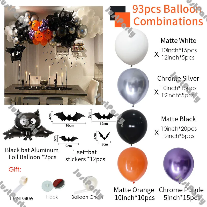 93 шт (9 футов) Комбинация воздушных шаровМатовый белый (10 дюймов * 15 шт., 12 дюймов * 5 шт.)Хром серебро (10 дюймов * 15 шт, 12 дюймов * 5 шт)Матовый черный (10 дюймов * 20 шт., 12 дюймов * 5 шт.)Матовый оранжевый 10 дюймов * 10 шт.Хром фиолетовый 5 дюймов * 15 штЧерный Летучая мышь Алюминиевая Фольга Воздушный шар * 2 шт1 комплект = наклейка в форме летучей мыши * 12 шт.Бесплатная доставка: 5 м цепочка на воздушный шар * 1Воздушный шар Клей * 100Крючок * 3