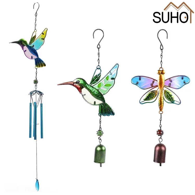 Hummingbird Wind Chimes Уникальный дизайн: Красивая витражная форма Колибри, ручная работа, чугун и акриловое украшение. 1 стеклянная подвеска. Кованое железное стекло ручной окраски спрей колокольчики ветра, сочетают Колибри с колокольчиками ветра; Сделать колокольчики ветра более интересными и vivid.