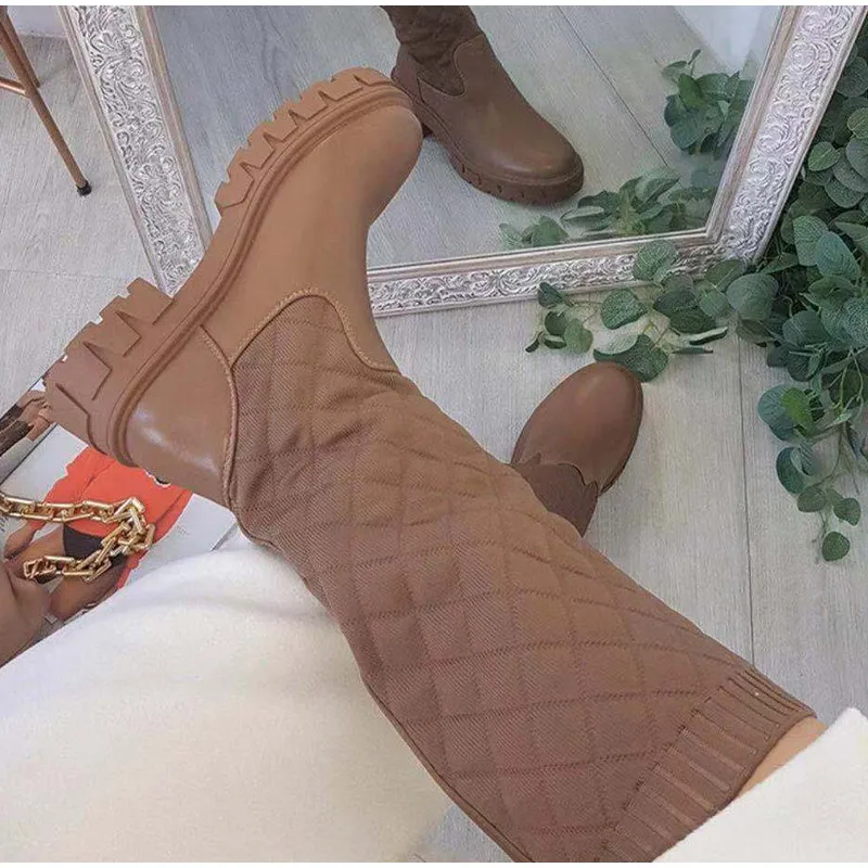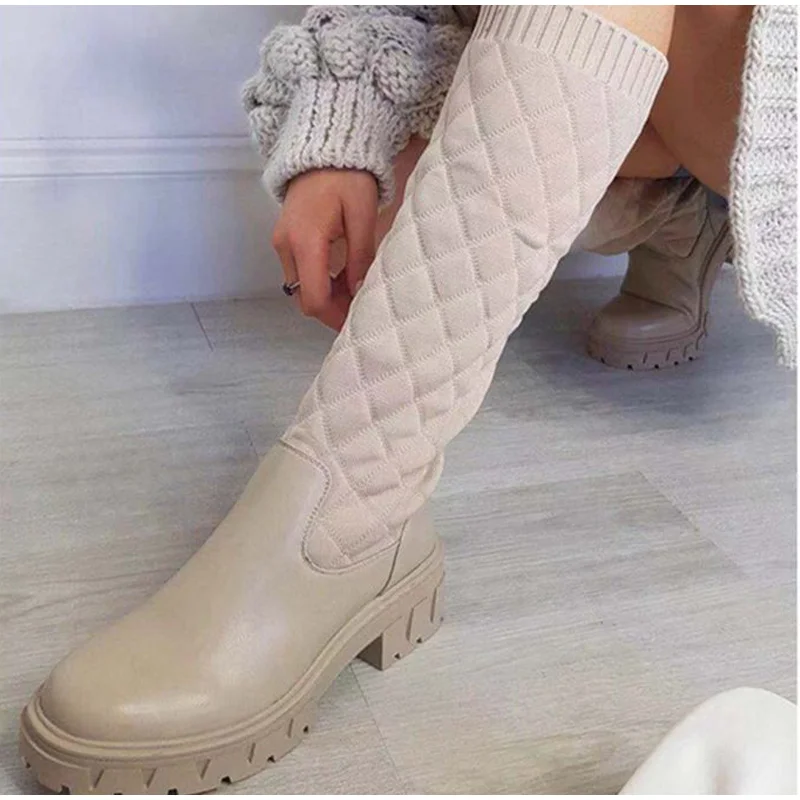 Женские кожаные сапоги без застежки, сапоги до середины икры на толстой платформе, с плетеным узором, большие размеры, модель 2021 года