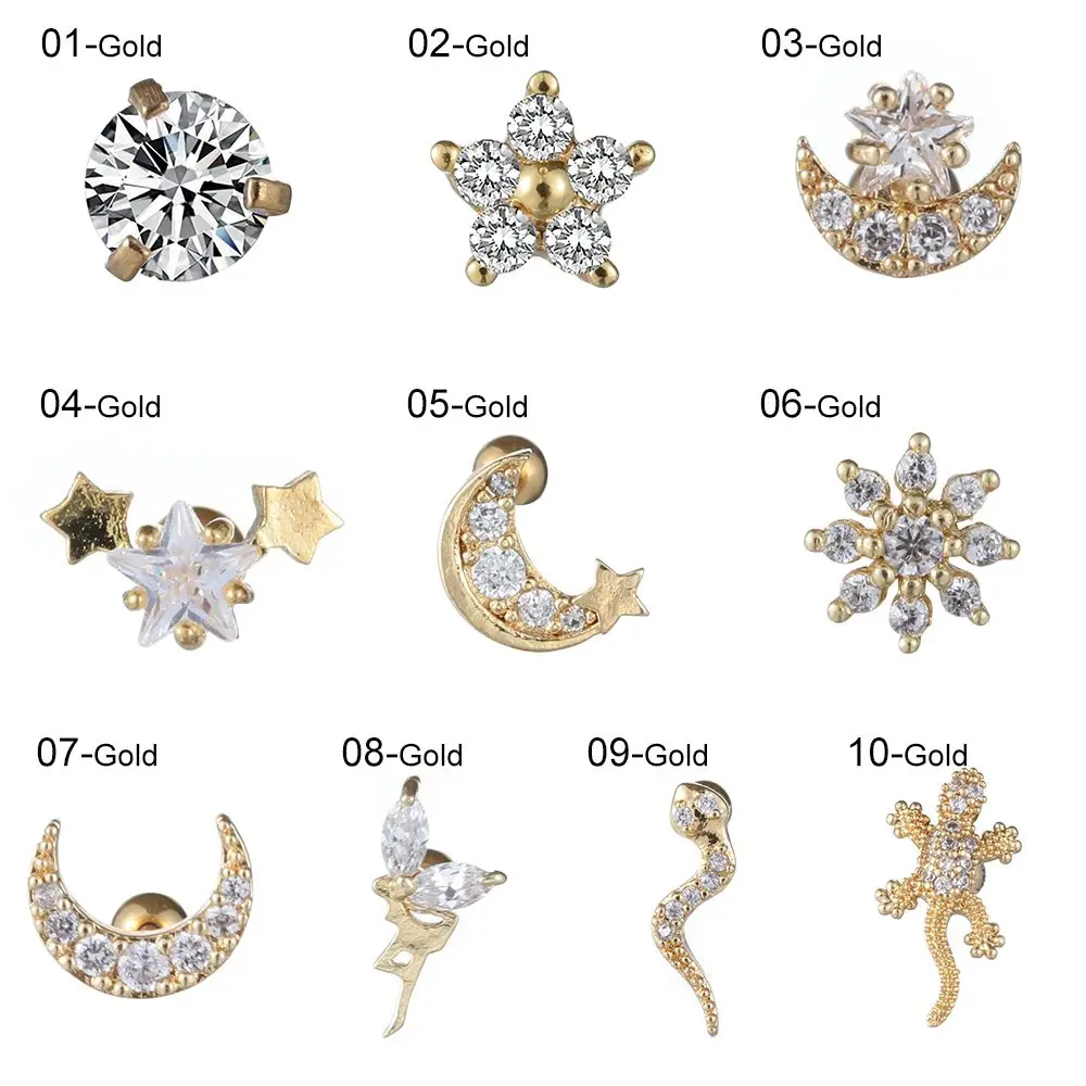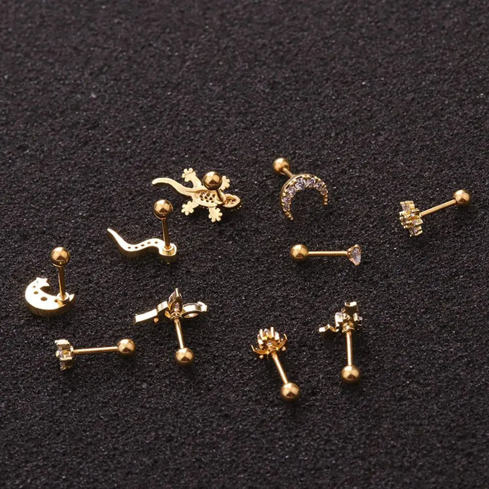 Серьги-гвоздики из нержавеющей стали, ювелирные изделия с винтом в виде змеи, ящерица, с декором луна, звезда, цветок, хрящевая спираль, ракушка, пирсинг с кристаллами, 20 г