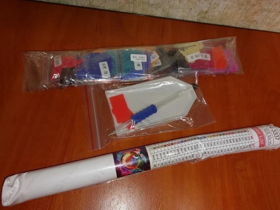 Доставка 3 недели.В наборе все как заявленно и пинцет и стилус с 2 насадками,галерта,большой лоток.Стразы квадратные в зип пакетах,что очень важно и приятно.Полотно намотано на валик ,но все равно немного примялось.Думаю это не критично .Уже предвкушаю одовольствие от выкладки этой картины